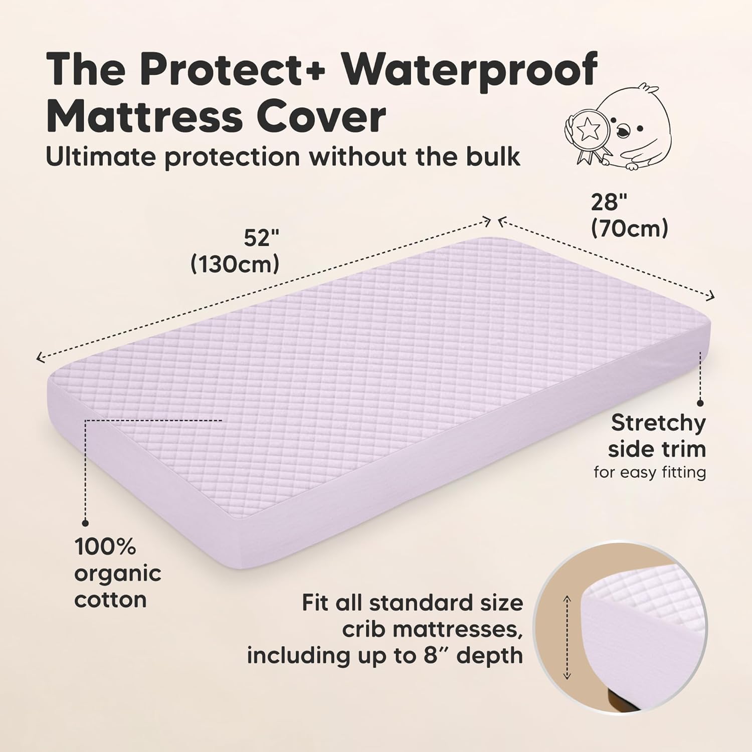 - Easy Fit - Our 52" x 28" x 8" toddler mattress protector sheets, fit well on standard size crib mattress, come with elastic hem for a snug, secure fit. Lightweight, easy to put on & remove, crib mattress topper for fuss-free crib mattress cover change