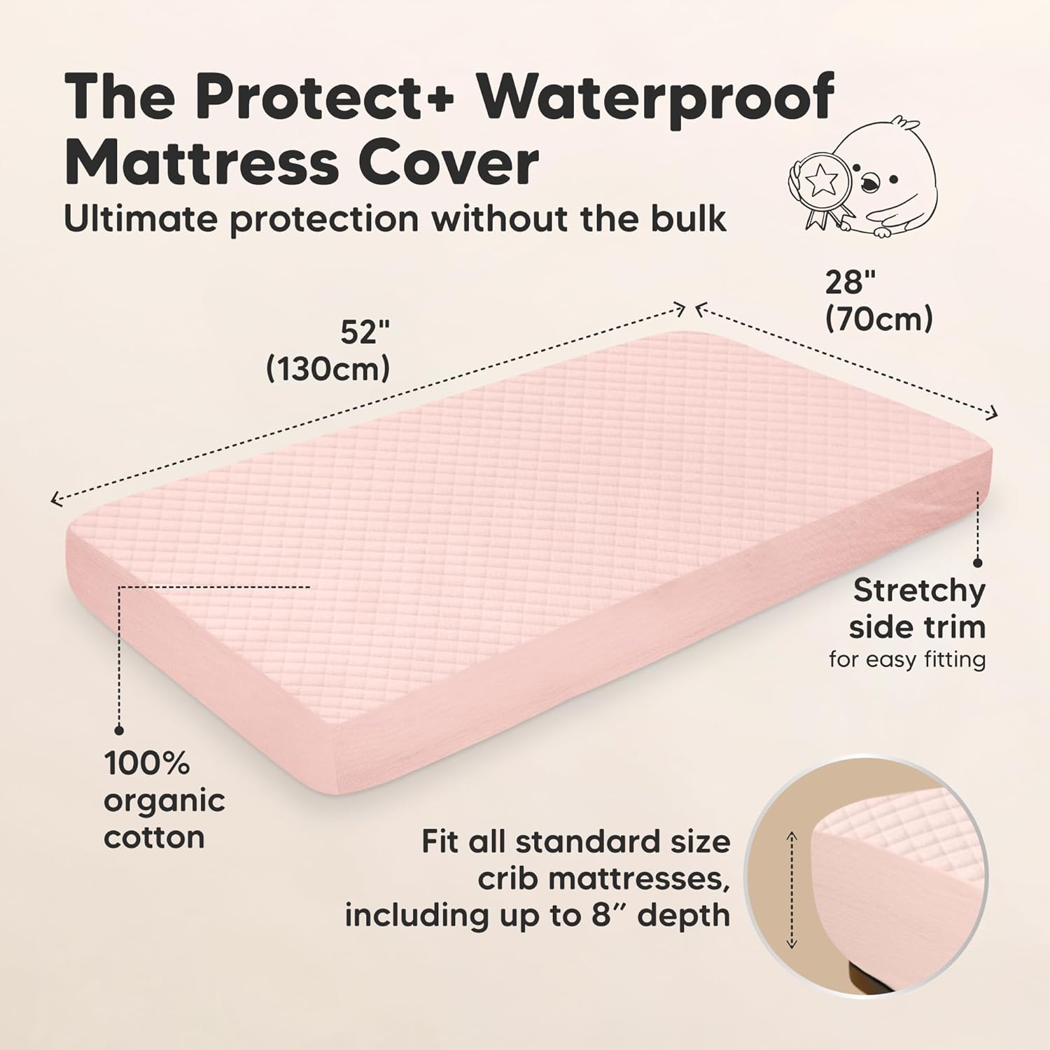 - Easy Fit - Our 52" x 28" x 8" toddler mattress protector sheets, fit well on standard size crib mattress, come with elastic hem for a snug, secure fit. Lightweight, easy to put on & remove, crib mattress topper for fuss-free crib mattress cover change