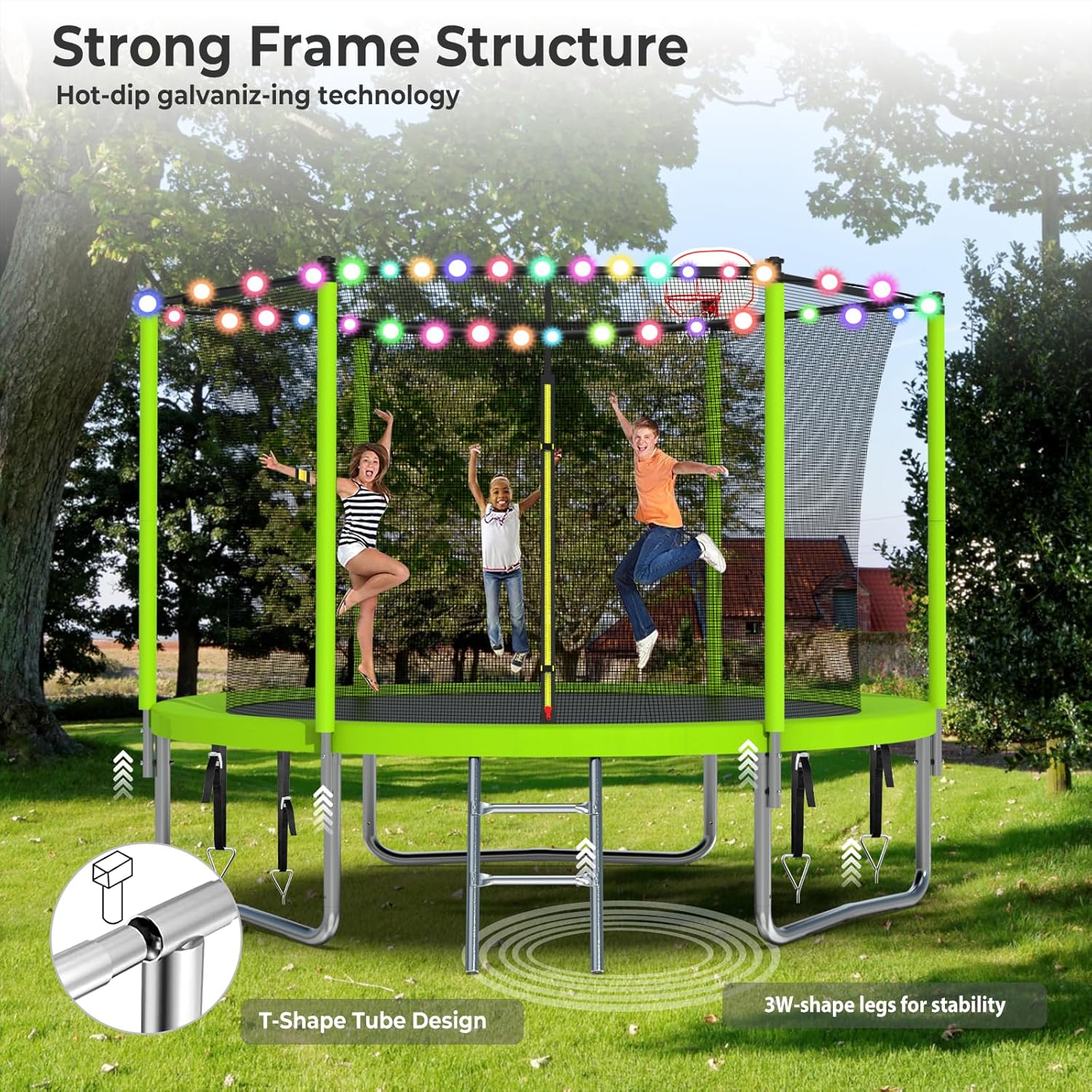 Upgraded 10/12/14/15/16FT Trampoline Outdoor, Large Kids Trampoline with Light, Stakes, Sprinkler, Backyard Trampoline with Basketball Hoop and Net, Capacity for 4-6 Kids and Adults