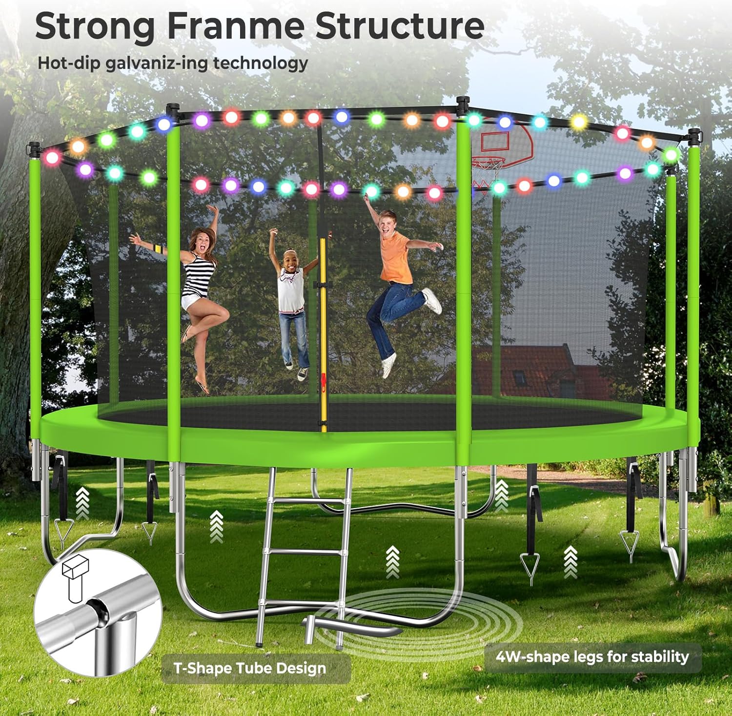 Upgraded 10/12/14/15/16FT Trampoline Outdoor, Large Kids Trampoline with Light, Stakes, Sprinkler, Backyard Trampoline with Basketball Hoop and Net, Capacity for 4-6 Kids and Adults