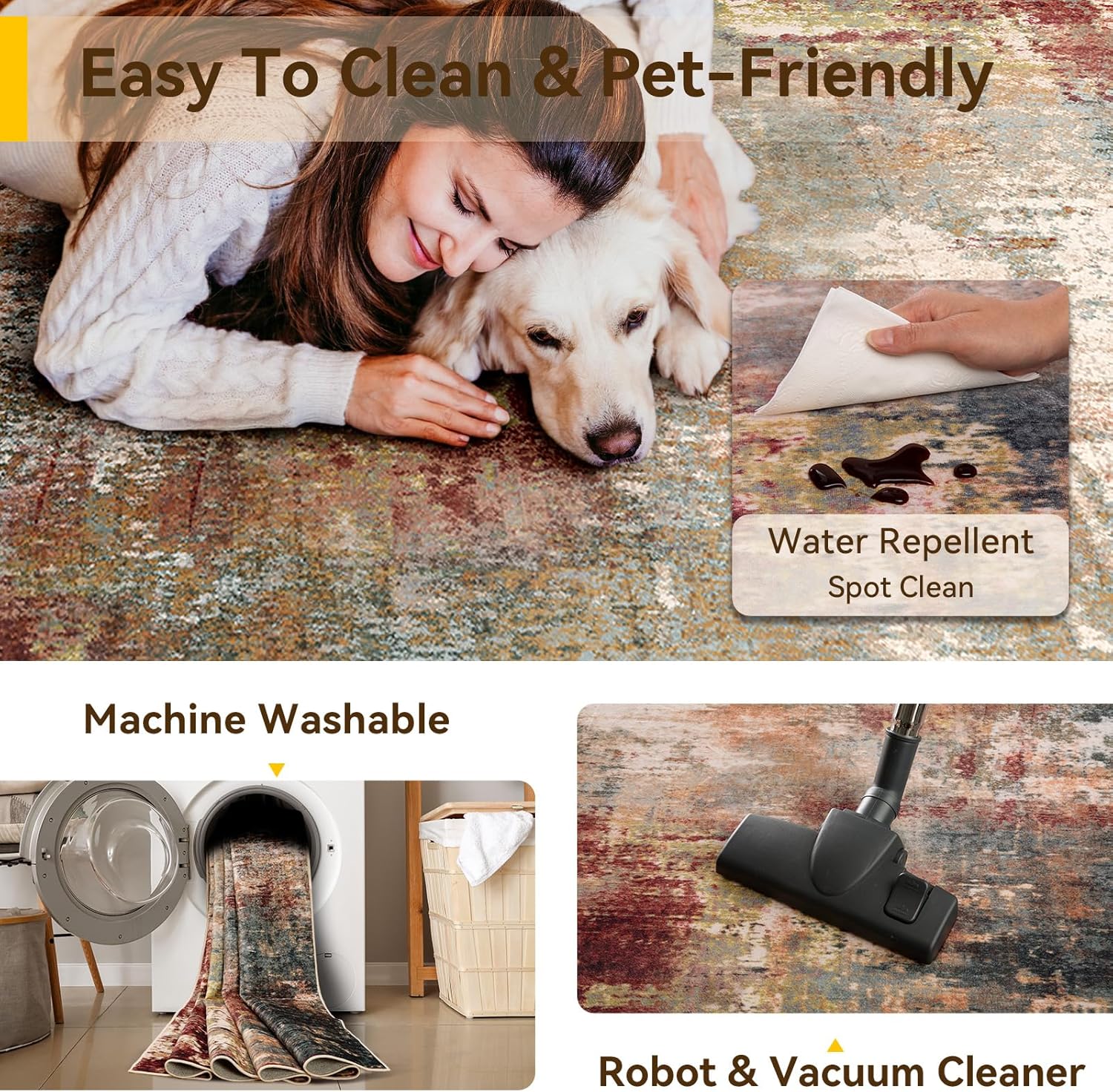 Washable Area Rugs 5'x7' Non-Slip Modern Abstract Soft for Living Room Entryway Bedroom Nursery, Print Pattern, Brown Rust Red Multi