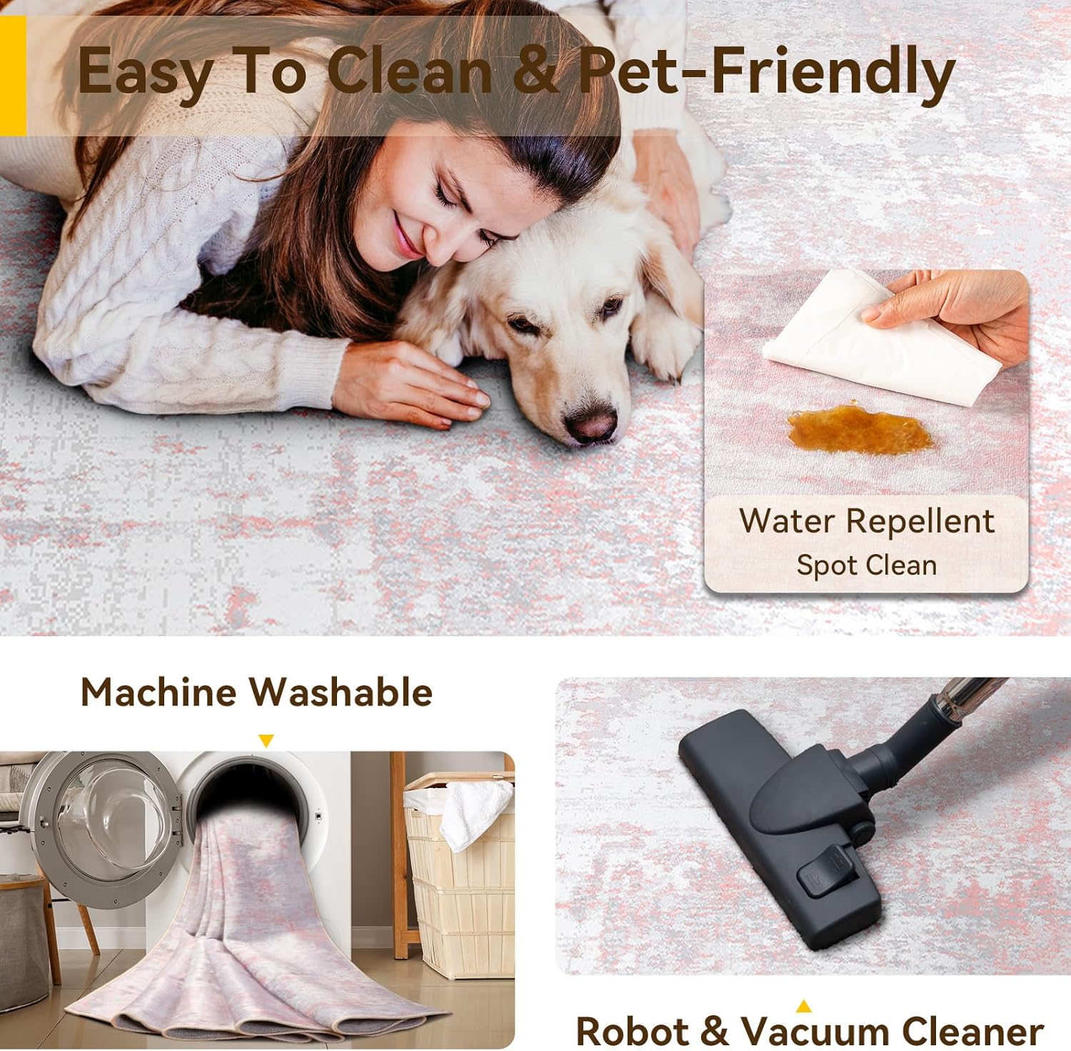 Washable Area Rugs 5'x7' Non-Slip Modern Abstract Soft for Living Room Entryway Bedroom Nursery, Print Pattern, Grey Pink