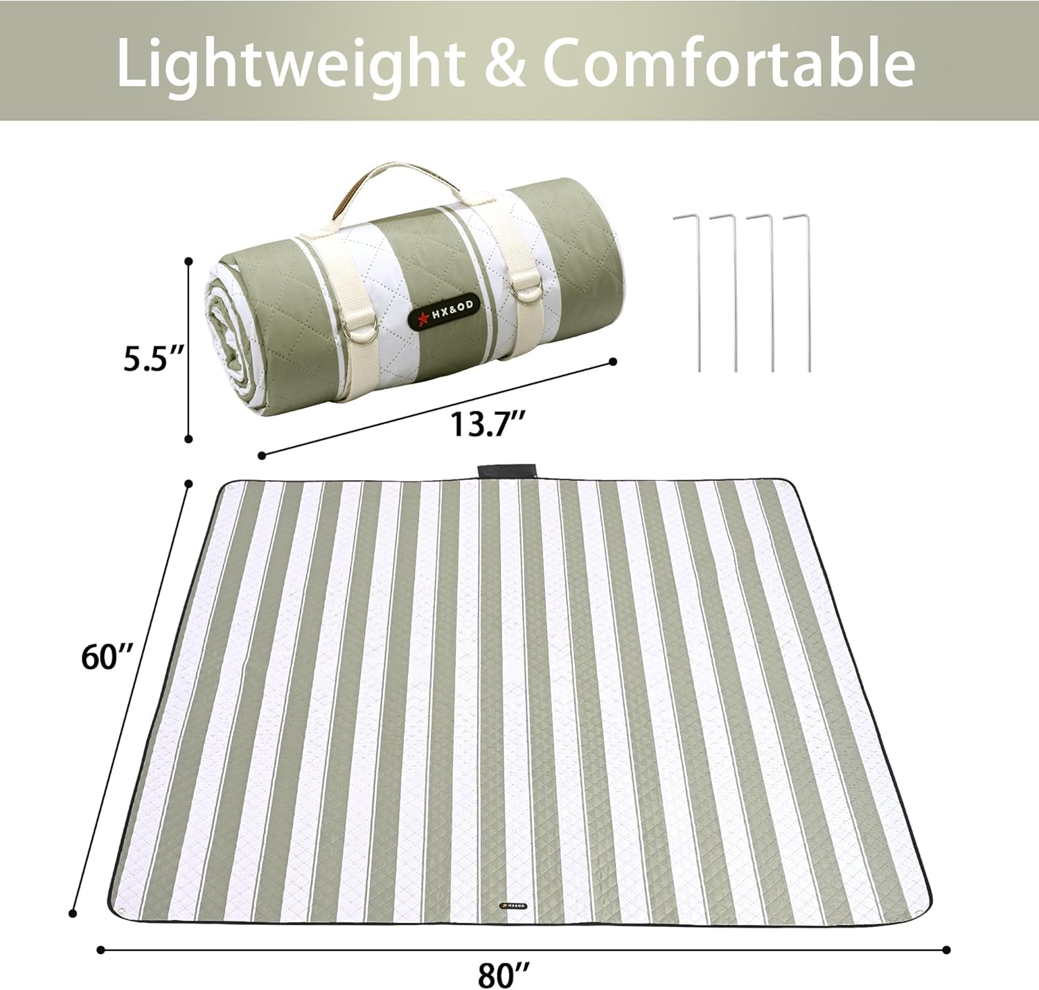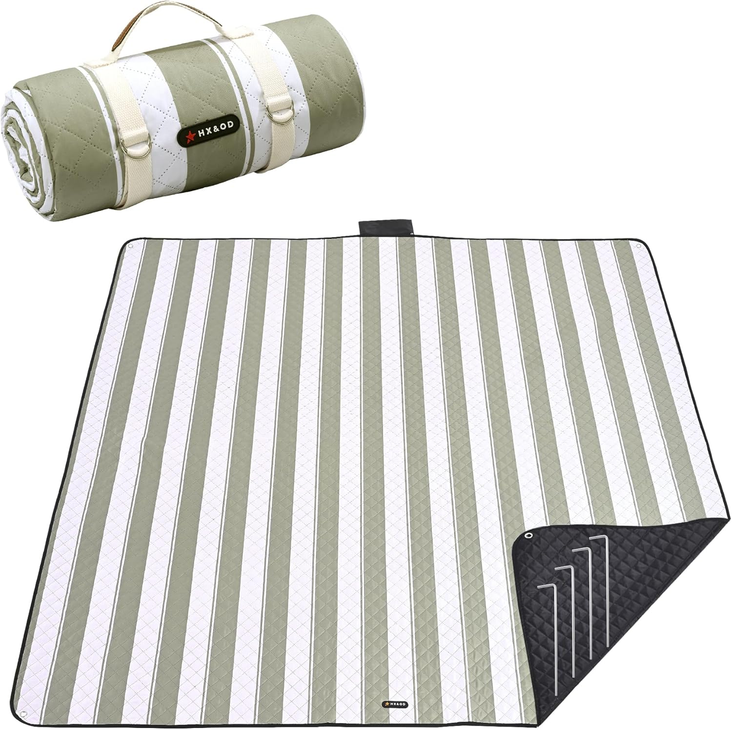 HX&OD Outdoor Picnic Blanket Extra Large, 80''*60'' Waterproof Picnic Mat with Stakes Foldable Camping Blanket Portable with Carry Strap for Beach Mat (Green& White, 80''*60'')