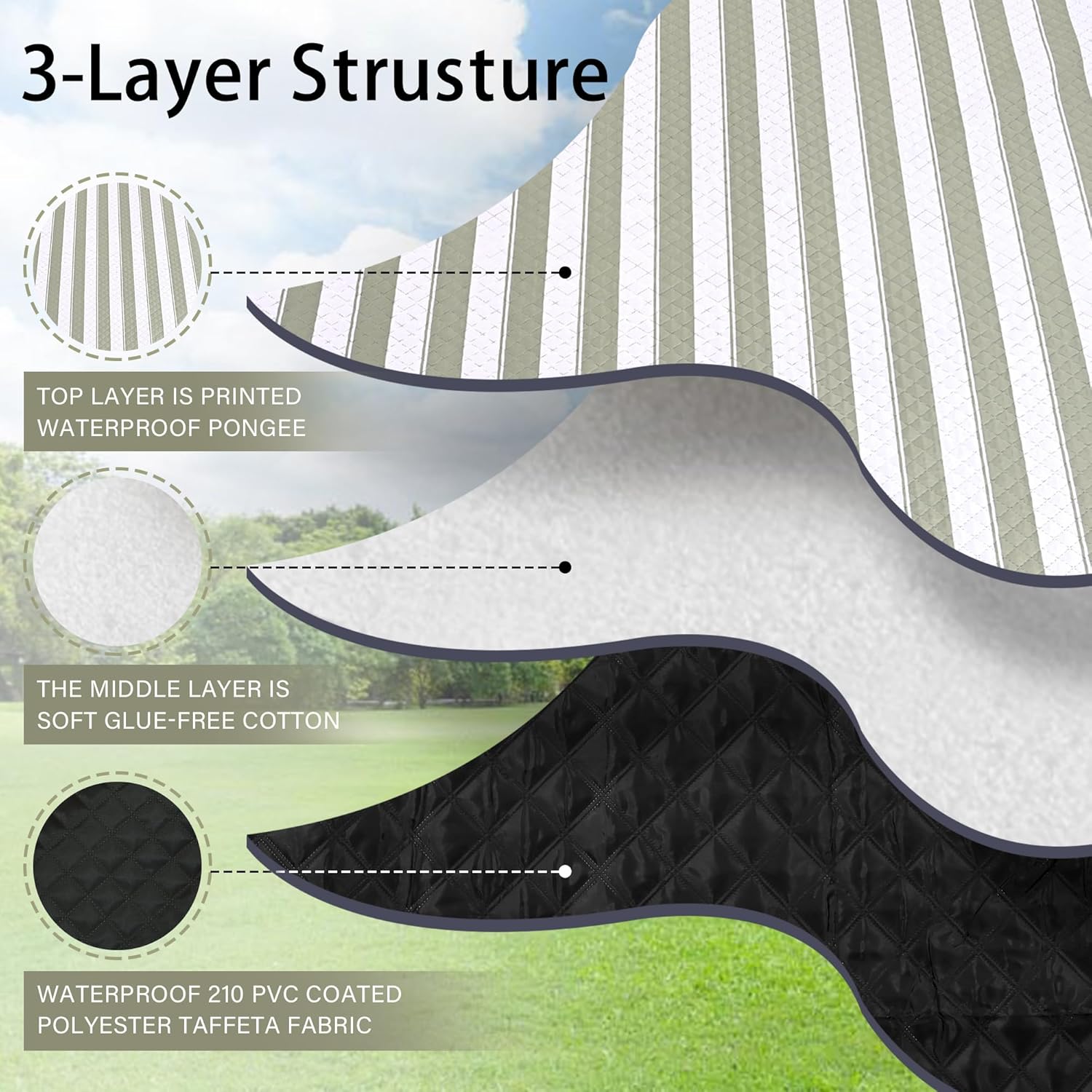 - ☀ 【Soft and Durable with 3-Layers】The picnic blanket top layer is printed waterproof pongee, the middle layer is soft glue-free cotton, and the bottom layer is waterproof black Oxford cloth. Perfectly suitable for siting or lying on grass, beach, floor or any kindly of surface, giving you soft and comfortable feelings.