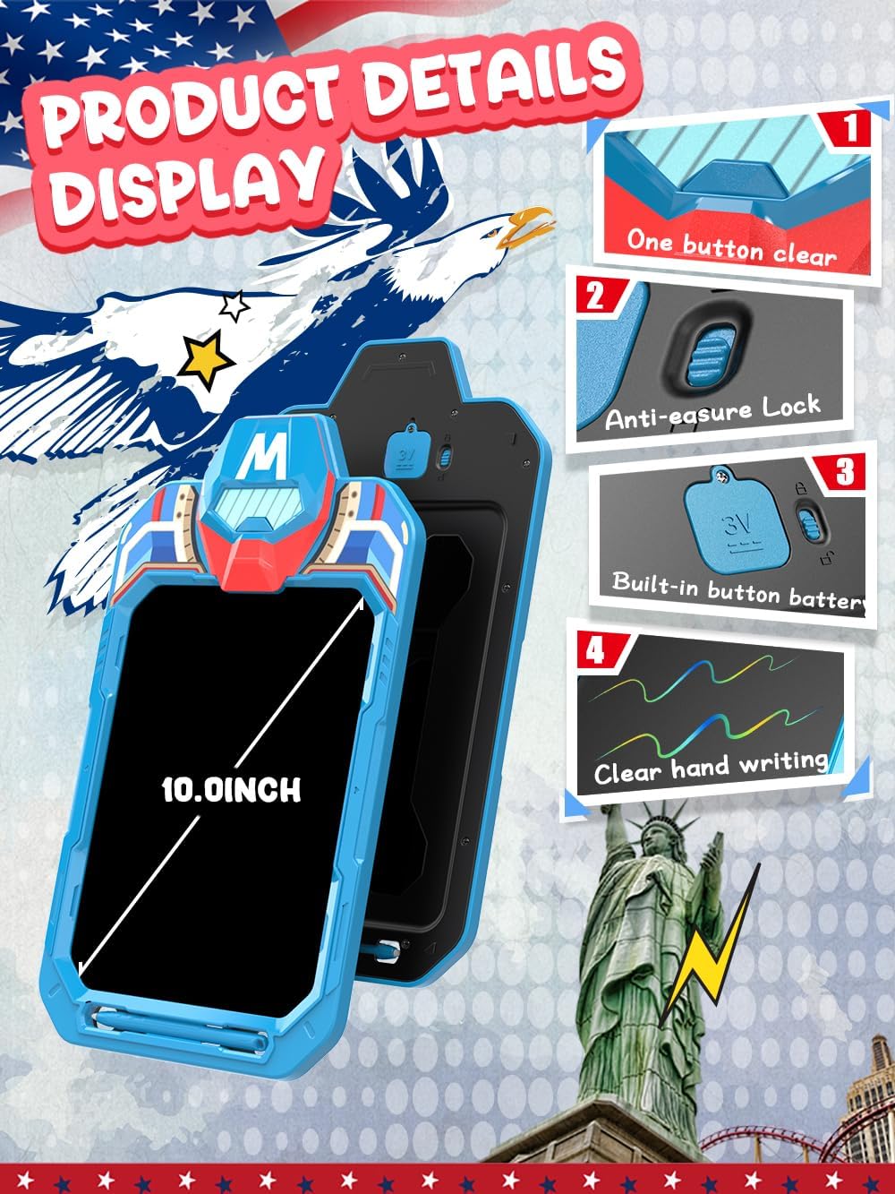 - 【NO BLUE LIGHT& PROTECT CHILDREN'S EYES, E-CO-FRIENDLY】BUKEBU LCD writing tablet use 10 inch eye protection material screen. The screen of drawing board is completely safe via the test: no glare, no radiation,no ink, no dust, paper-like vision, which can protect your kids' eyesight .the lines are colorful, clear and eye-catching. The screen is not self-illuminating, and its optical writing characteristics are the same as papers.it's created to protect toddlers' eyesight better.