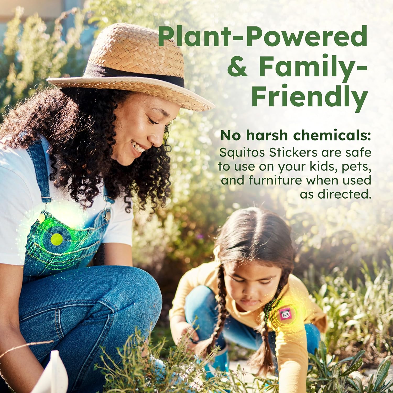 - Squito Stickers are our easy-to-use mosquito repellent patches that are essential-oil based and do not contain DEET or other harmful chemicals. It contains natural Citronella oil that effectively repels mosquitoes. Just stick to any surface such as your clothing, hats, bags, strollers, and more. Squito Stickers are perfect for pool days, camping, or any other outdoor and indoor activities.