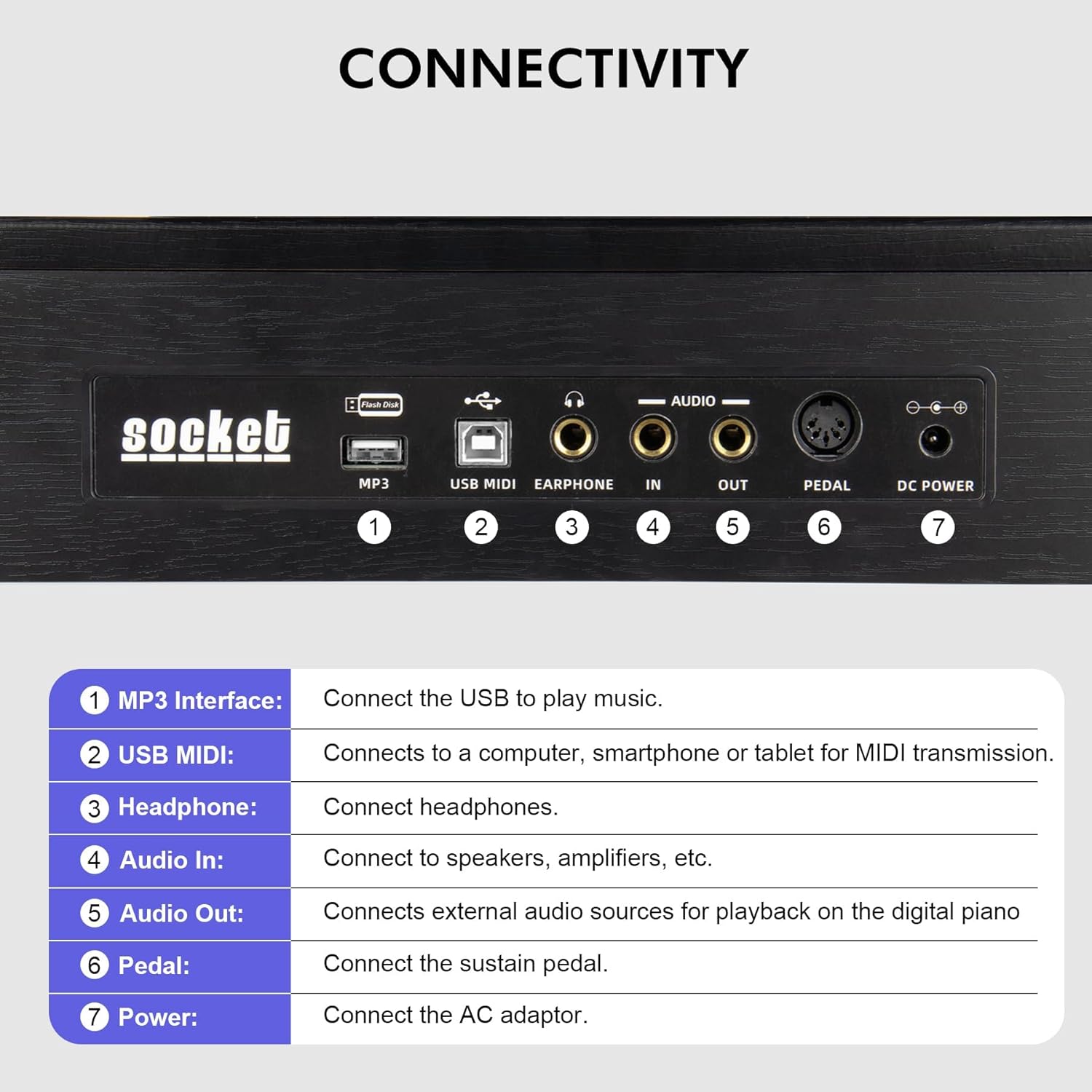 - DIGITAL PIANO SET: Full-size 88 key piano keyboard with triple pedal, music stand, headphones, music clips, piano cover and key stickers. Imitating the touch of an acoustic piano, it is perfect for beginners to explore the wonderful world of music.