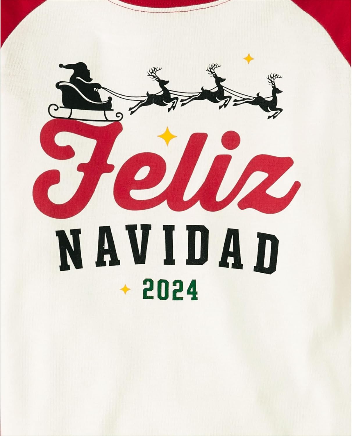 - PAJAMA TOP: Crew neck, raglan long sleeves, 'Feliz Navidad 2024' graphic, banded cuffs