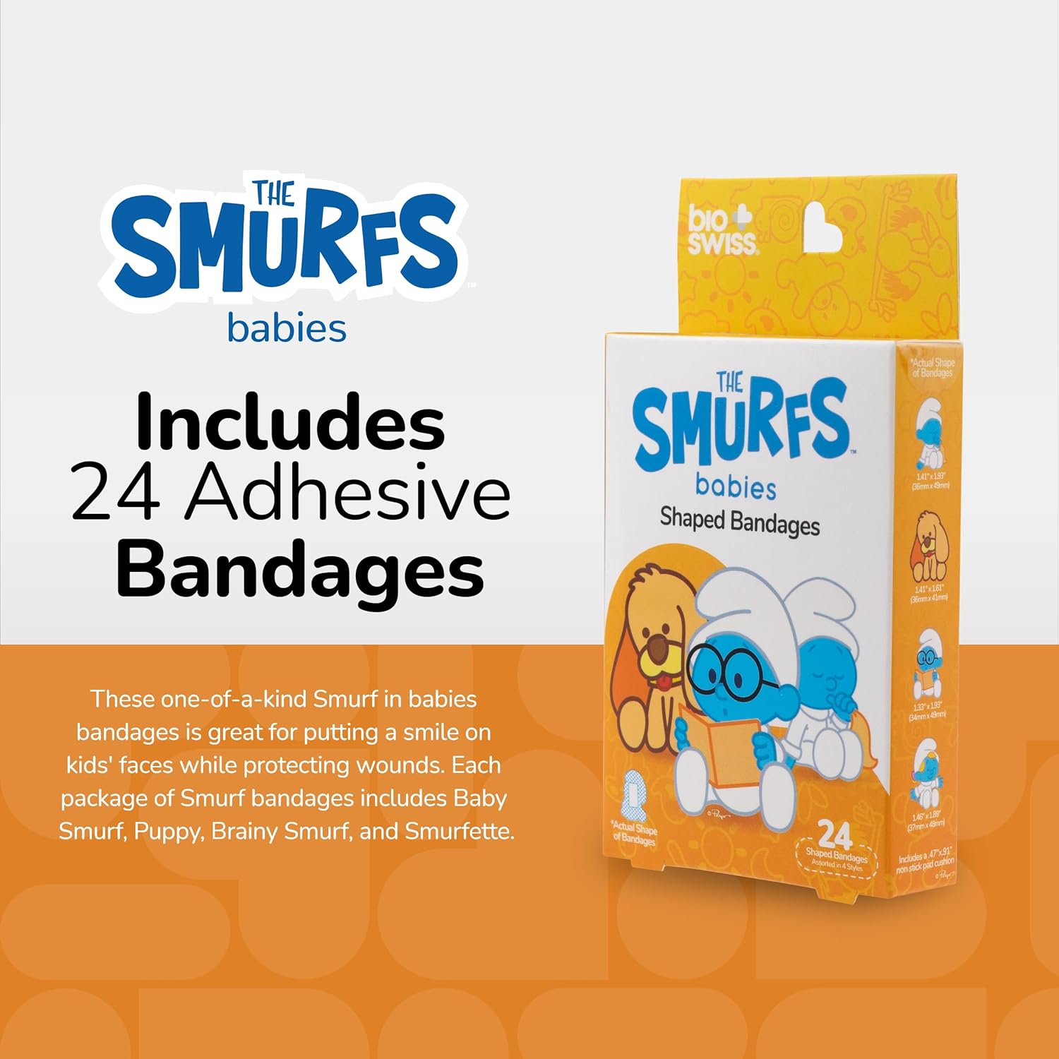 - BABY SMURF BANDAGES: This 24 piece cardboard box of childhood classic cartoon Baby Smurf shaped bandages is great for putting a smile on kids' faces while protecting wounds such as cuts, scrapes, and burns, and come in a variety of your favorite characters; Baby Smurf, Puppy, Brainy Smurf, and Smurfette. These sticky bandages are perfect for kids and adults alike, and also for school nurses and pediatric doctors