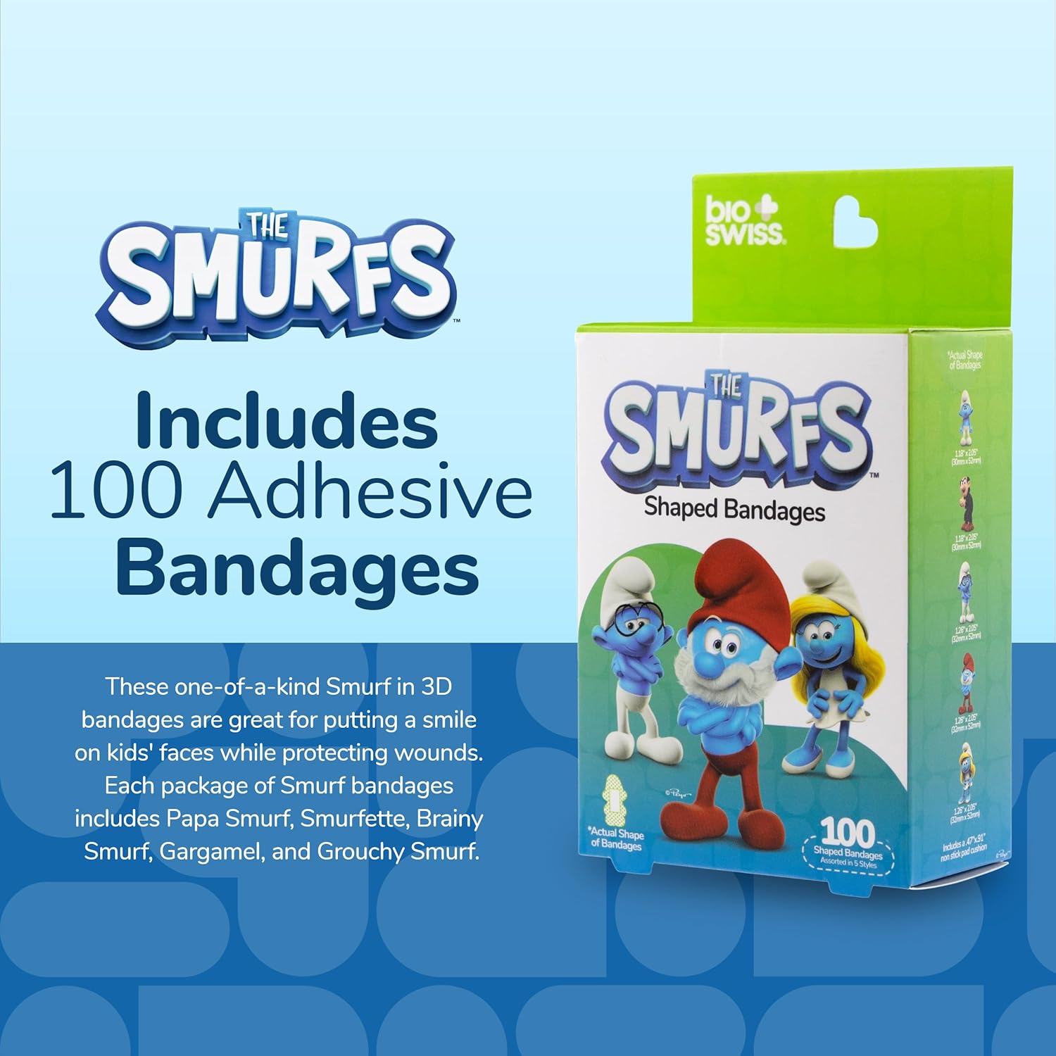 BioSwiss Bandages, The Smurfs Shaped Self Adhesive Bandage, Latex Free Sterile Wound Care, Fun First Aid Kit Supplies for Kids and Adults, 100 Count Box
