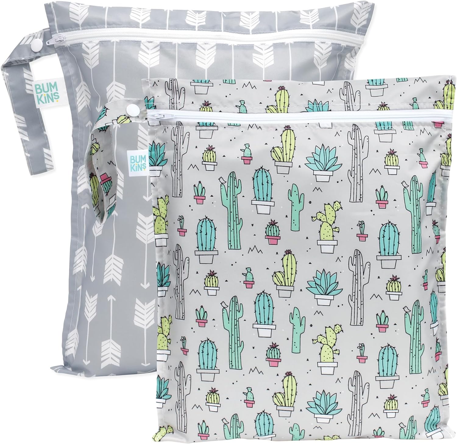Bumkins - Waterproof Wet Bag - For Baby, Travel, Swim Suit, Cloth Diapers, Pump Parts, Pool, Gym, Toiletry, Strap to Stroller - Reusable & Easy to Clean - 2pk - Cactus & Arrows