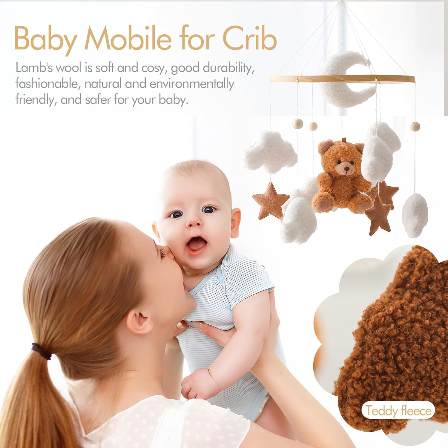 - Teddy Velvet Nursery Mobile:Baby mobile for crib can blend into the nursery design of your choice. The white moon and clouds, brown stars, and brown bear will be focal points in your neutral nursery,We share your goal to making sure your baby is exposed to something nice and safe from birth