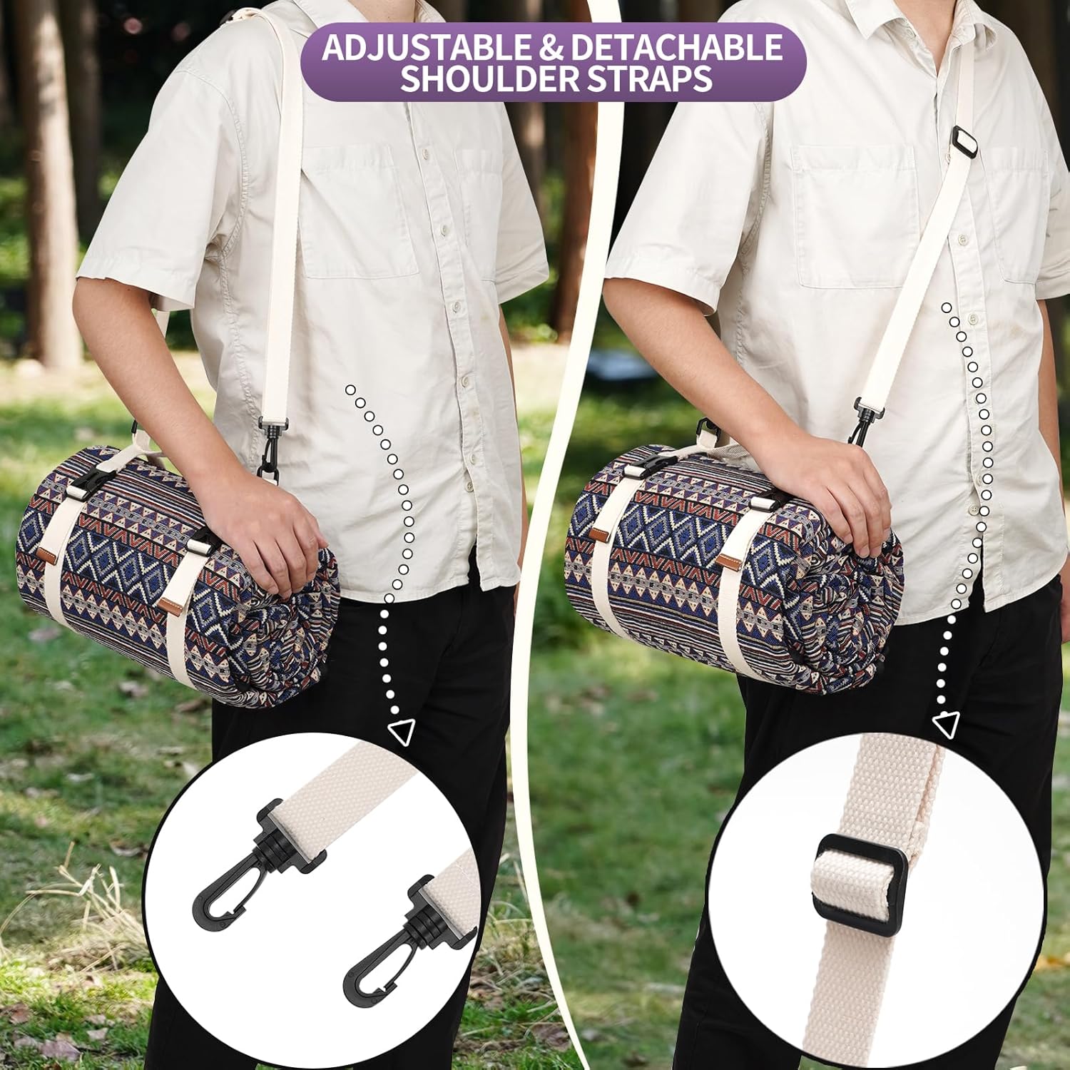 - ADJUSTABLE SHOULDER STRAPS - The portable picnic blanket can be carried easily by hand, on either shoulder by adjusting to the proper lengths, so you can carry other picnic suppliers with the other hand,the handle strap with double ring buckle is convenient to carry, and can easily fold and fix the picnic mat,so if you don't fold it exactly as originally packed, it will fit anyway,saving a lot of space on the travel.