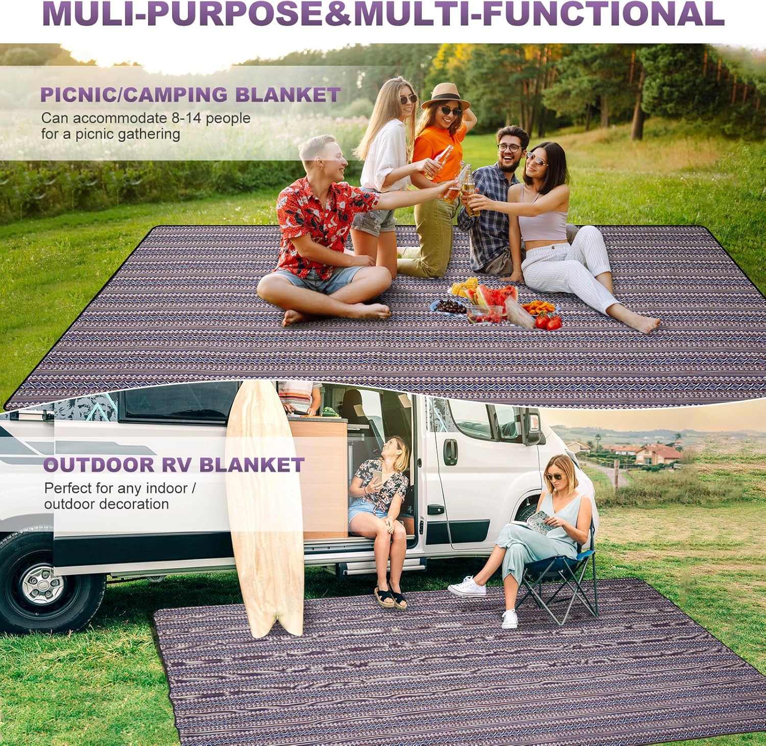 - EXTRA LARGE & FOLDABLE - Unfolded portable picnic blanket is 9'X 6'. Can accommodate 8-10 people to sit on it idealfor patio, camper, RV road trips, camping, balcony, picnic, porch, deck and garden, or simply to have a clean and comfortable picnic mat for your kids to play on.