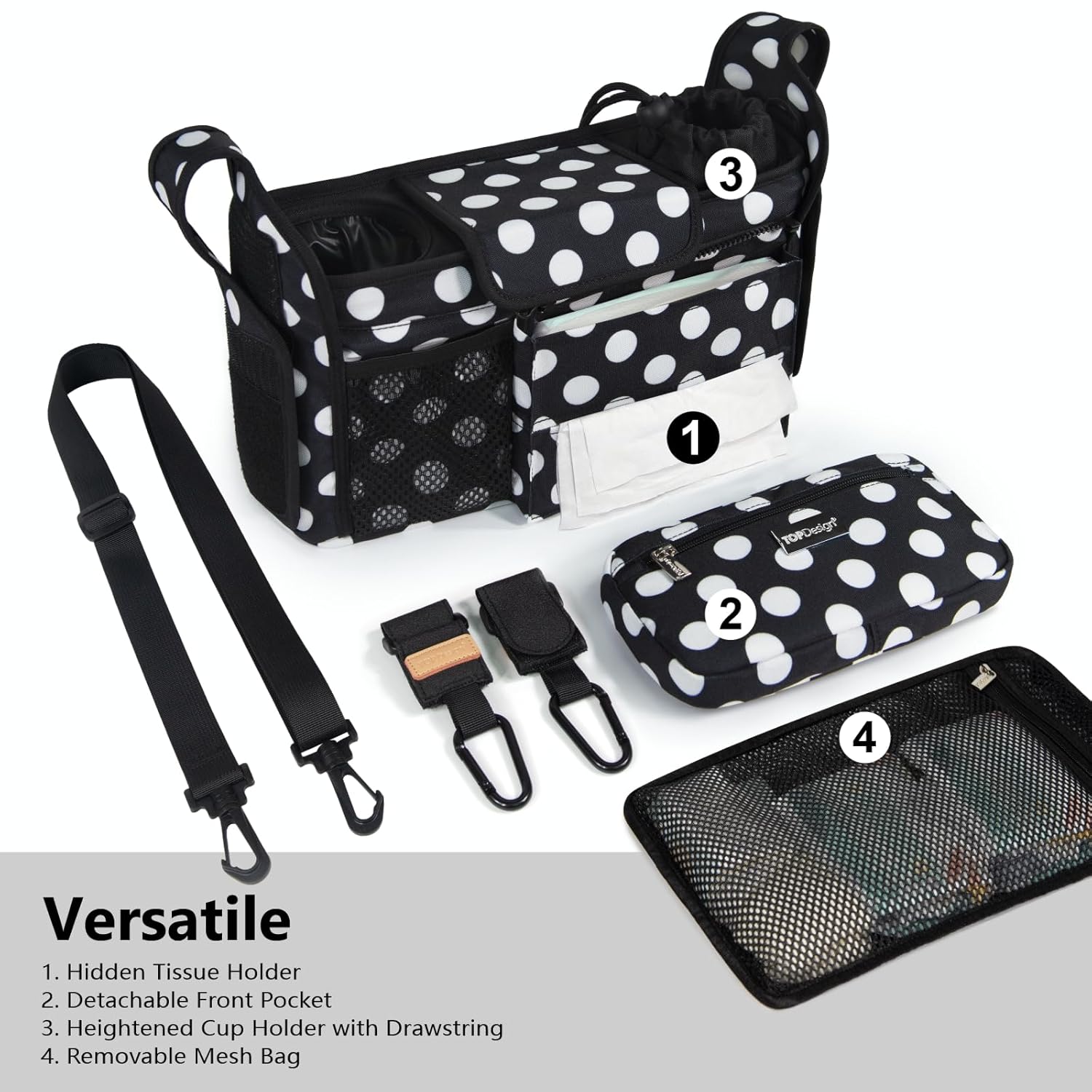 TOPDesign Universal Baby Stroller Organizer, Stroller Caddy with Detachable Mesh Bag & Heightened Insulated Cup Holders & Non-Slip Secure Hooks Accessories, Fits Most Strollers (Polka Dots)