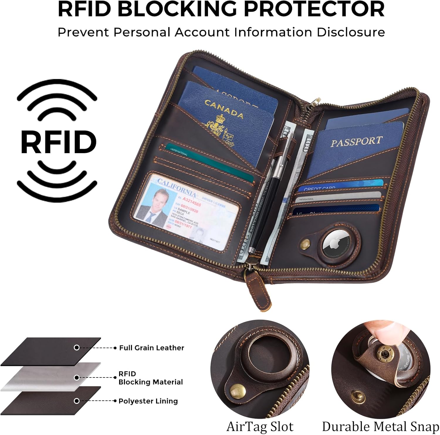 - Large Capacity - 6 passport pockets, 4 card pockets, 1 ID card window, 2 large pockets for cash, 1 pen holder, 1 AirTag slot, 1 front pocket and 1 removable strap.