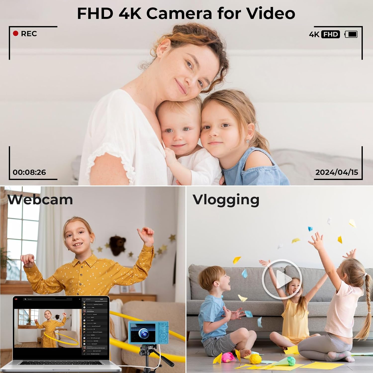 - 【Webcam Ready & Easy Charging】 Use our point and shoot digital cameras to take pictures and videos, or connect via a Type-C cable, perfect for video calls or streaming on YouTube, Tik Tok, Instagram, and Facebook. Compatible with tripods for steady use. Features long-lasting rechargeable batteries supporting continuous recording while charging.