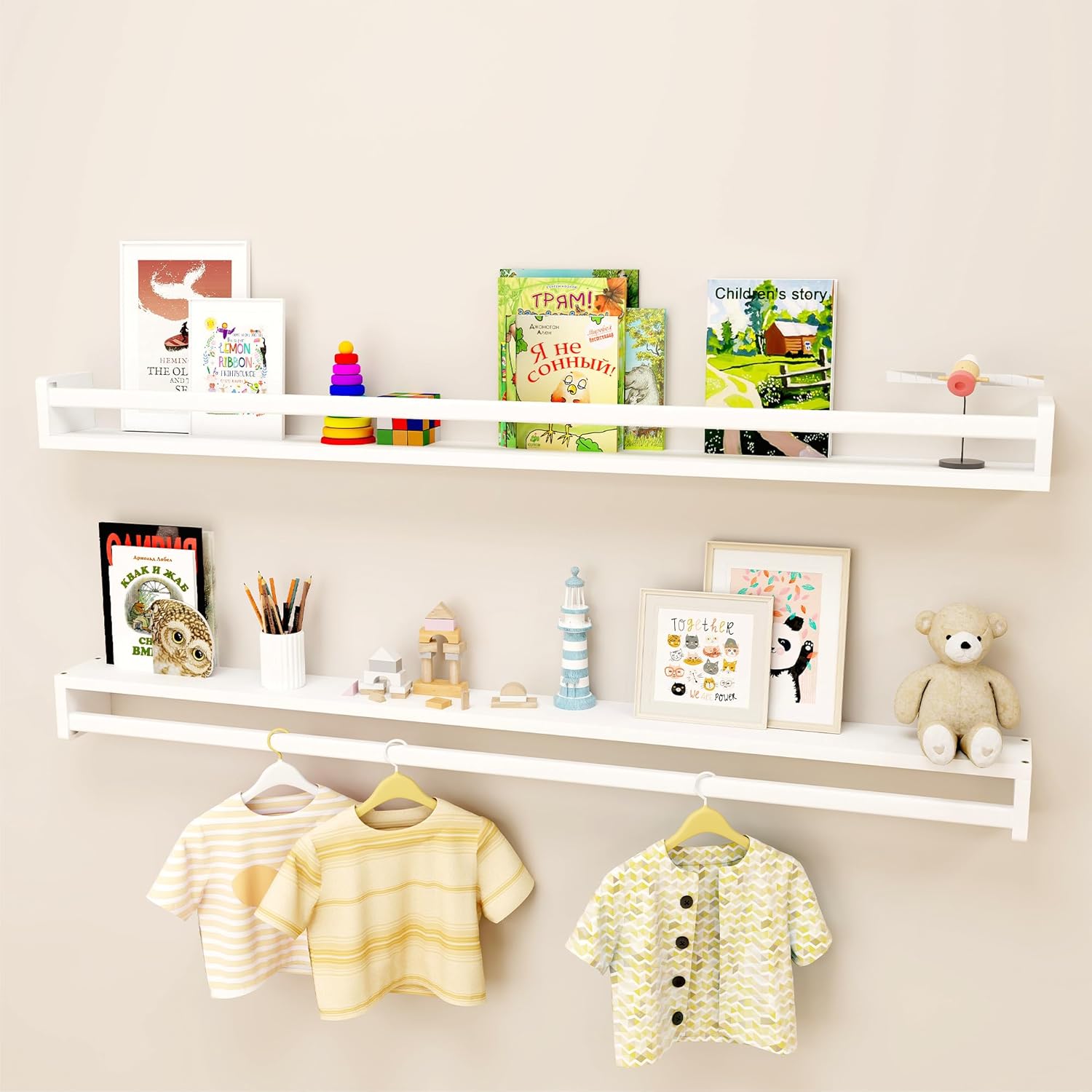 - Stylish & Functional: These versatile floating shelves add both style and storage functionality to any nursery or kids' room. The hanging rod provides a handy space to store children's clothing, while multiple shelves provide ample space for books, toys and more
