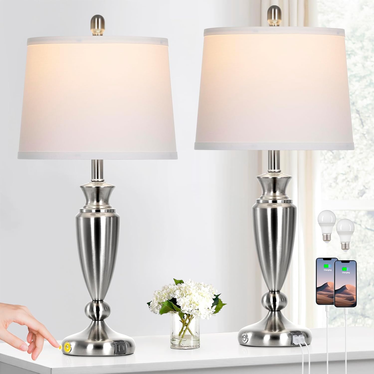 Metal Table Lamps Set of 2, 3 Way Touch Control Silver Bedside Lamps with USB A+C Ports, Modern Brushed Nickel Nightstand Lamps for Bedroom Living Room