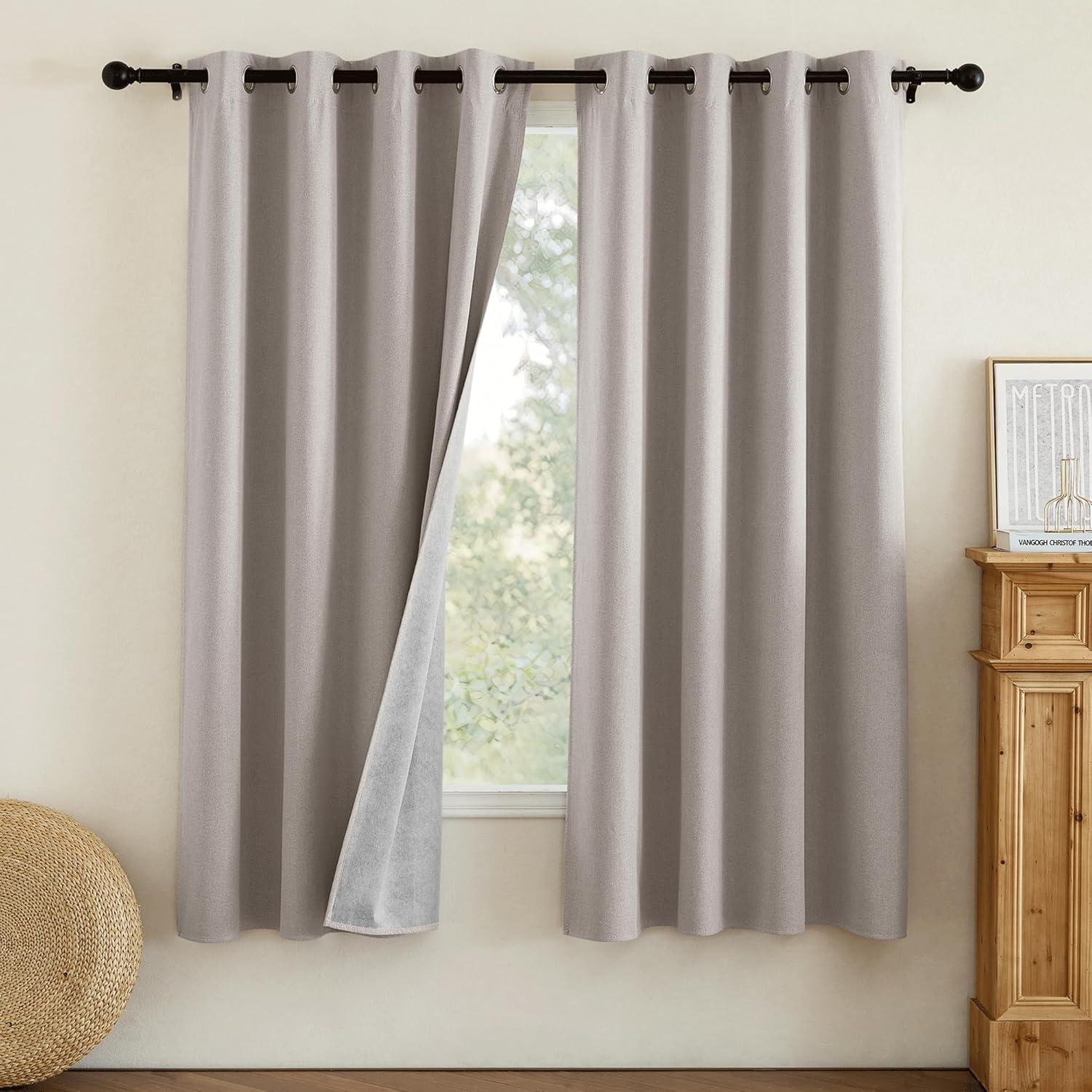 NICETOWN Natural Bedroom Full Blackout Faux Linen Curtain Panels Set of 2, 52" by 72", Thick Insulated Classic Grommet Blackout Draperies with White Thermal Insulated Liner for Windows