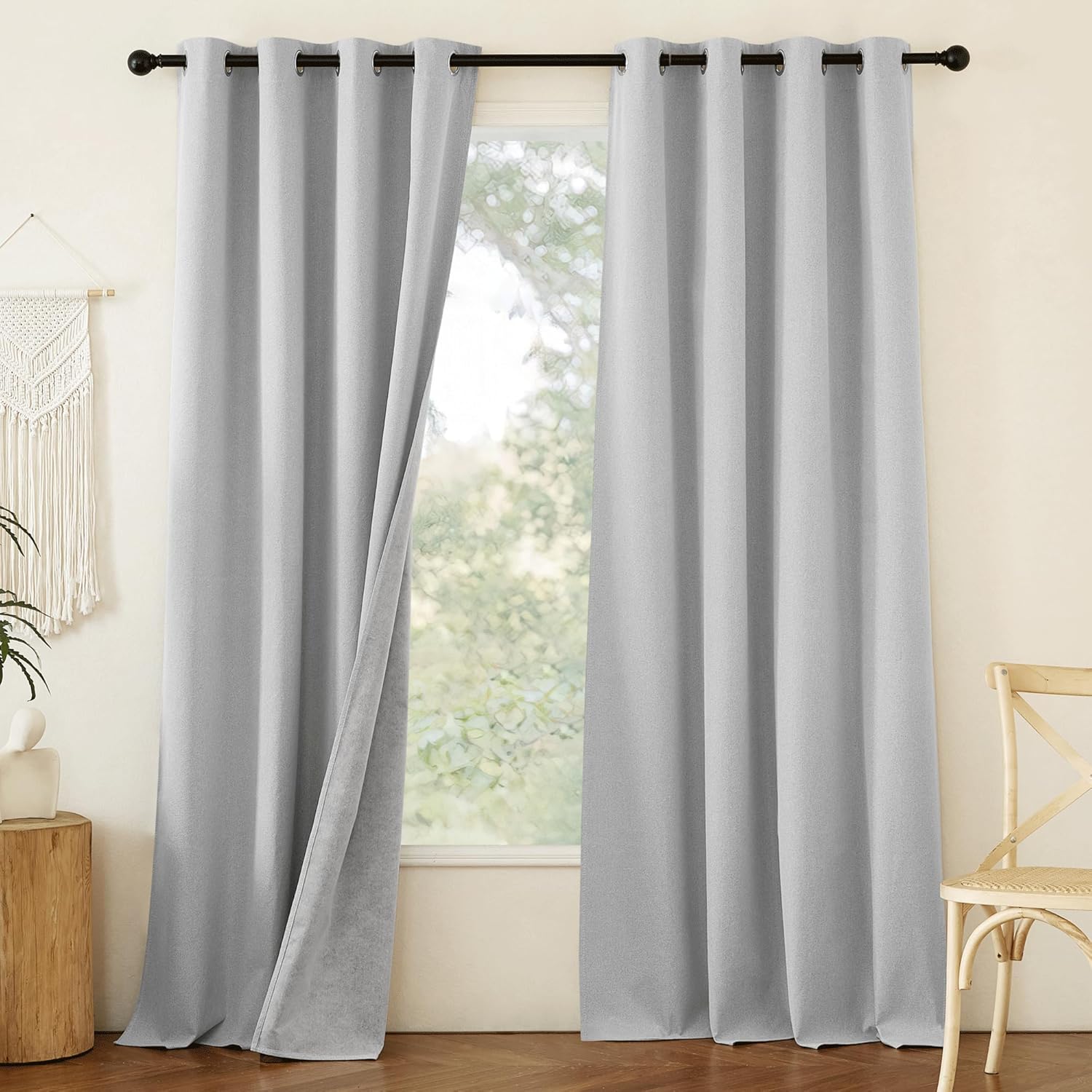 NICETOWN 100% Absolutely Blackout Faux Linen Curtains with Thermal Insulated White Liner, Greyish White, W52, 2 Pieces, Noise Reducing Faux Linen Look Curtains for Windows 90" Length for Classroom