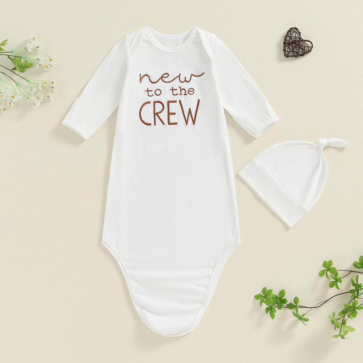 • DESIGN: Newborn knotted gown/open bottom sleeper and hat set, long sleeve infant gowns, Hi I'm new here, New to the crew letter embroidered tie slpeeing bag, baby boy coming home outfits newborn baby nightgowns, infant sleeper baby sleep gown with mittens, cute unisex babies clothing, new born baby essentials must haves