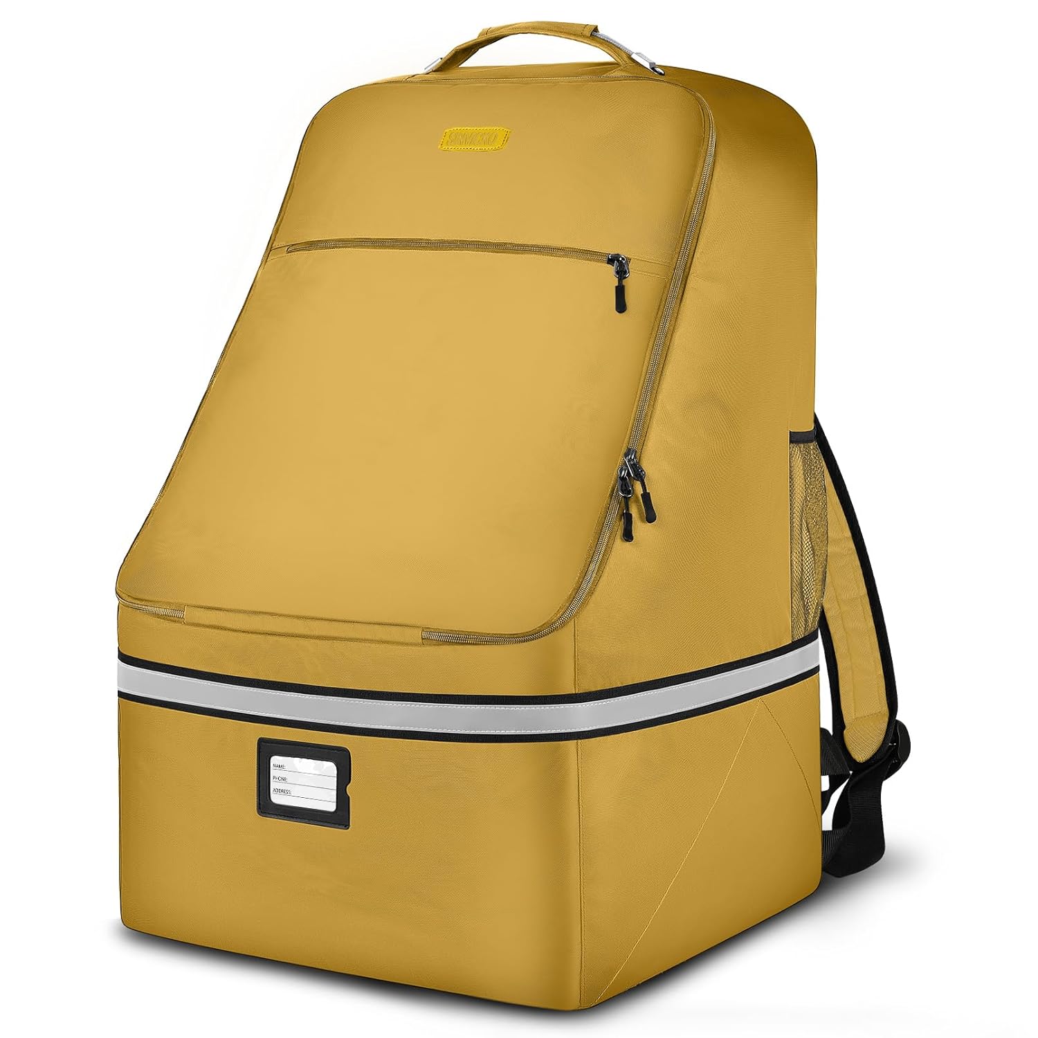 - Comfortable: A rugged handle with steel cable on the top is easy for you to carry with one hand.In addition, there are reflective strips on the strap, which is convenient for you to travel at night. Padded interior wings and internal fixing strap hold infant car seat in its place.Padded backpack straps and waist strap are adjustable, providing a comfortable, carrying option for parents. Ergonomic infant car seat travel bag for airplane.