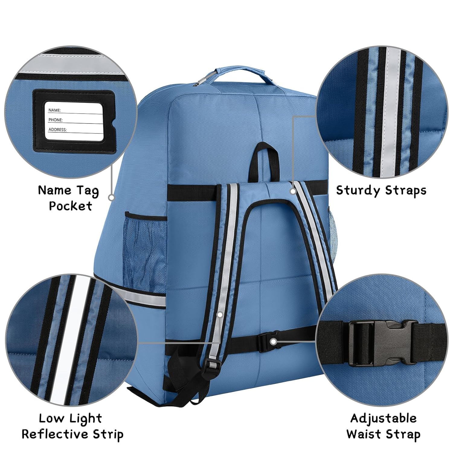 - Comfortable: A rugged handle with steel cable on the top is easy for you to carry with one hand.In addition, there are reflective strips on the strap, which is convenient for you to travel at night. Padded interior wings and internal fixing strap hold infant car seat in its place.Padded backpack straps and waist strap are adjustable, providing a comfortable, carrying option for parents. Ergonomic infant car seat travel bag for airplane.