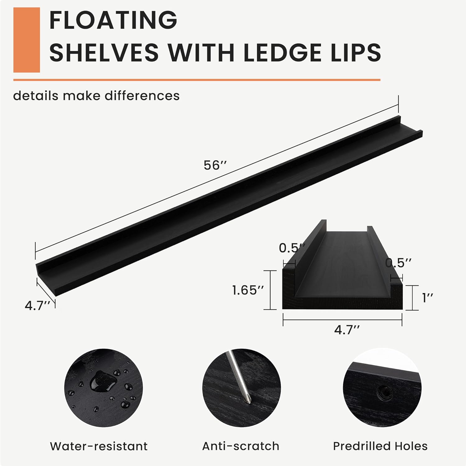 - Secure and Reliable: The mounting holes are expertly spaced at 16 inches to align perfectly with wall studs, ensuring a secure installation. Each wall shelf supports up to 45 lbs, This thoughtful design guarantees that your floating shelf with lip are anchored safely, offering stability and peace of mind for displaying any of your favorite items