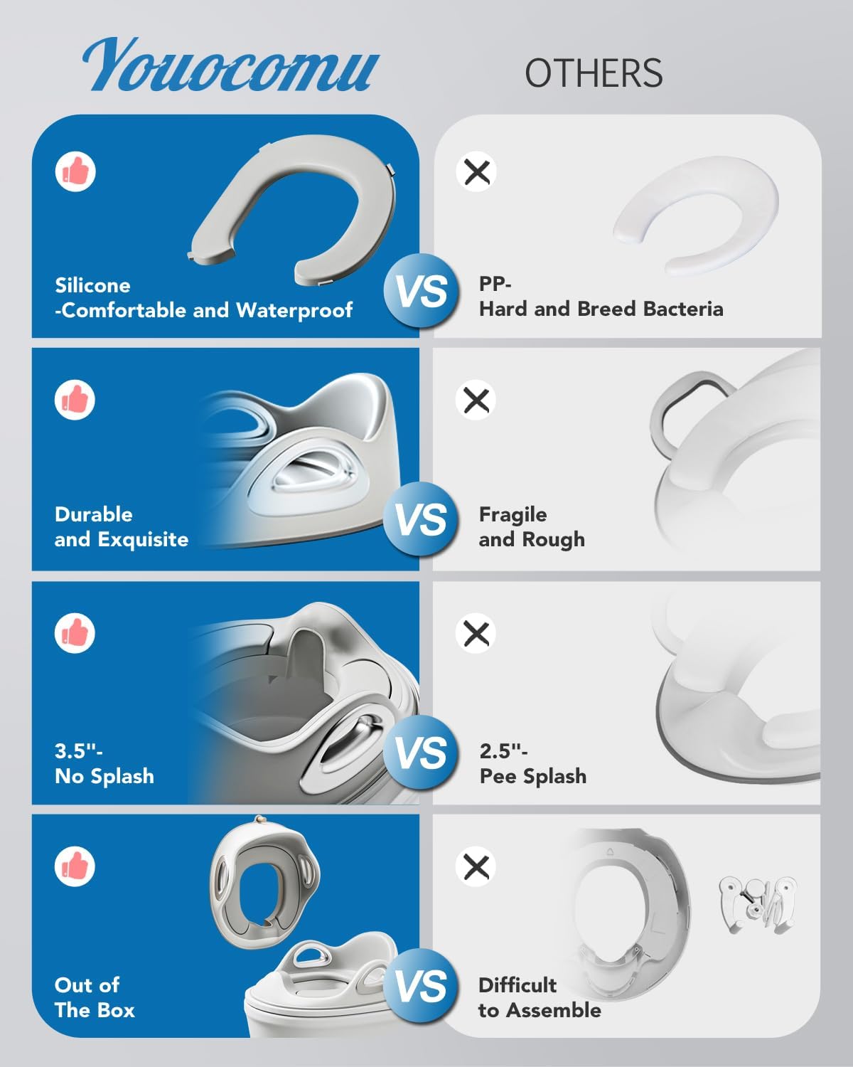 - CONVENIENT DESIGN: Our Toilet Training Seat fits most standard toilets securely. It's lightweight and perfect for travel use as well.(Includes free storage hook)