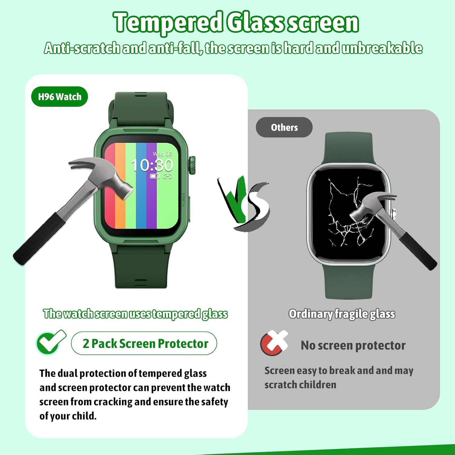 - Tempered Glass Kids Watch: The smart watch for kids features a tempered glass screen for enhanced durability, protecting it from bumps and falls and keeping your child safe from potential scratches.