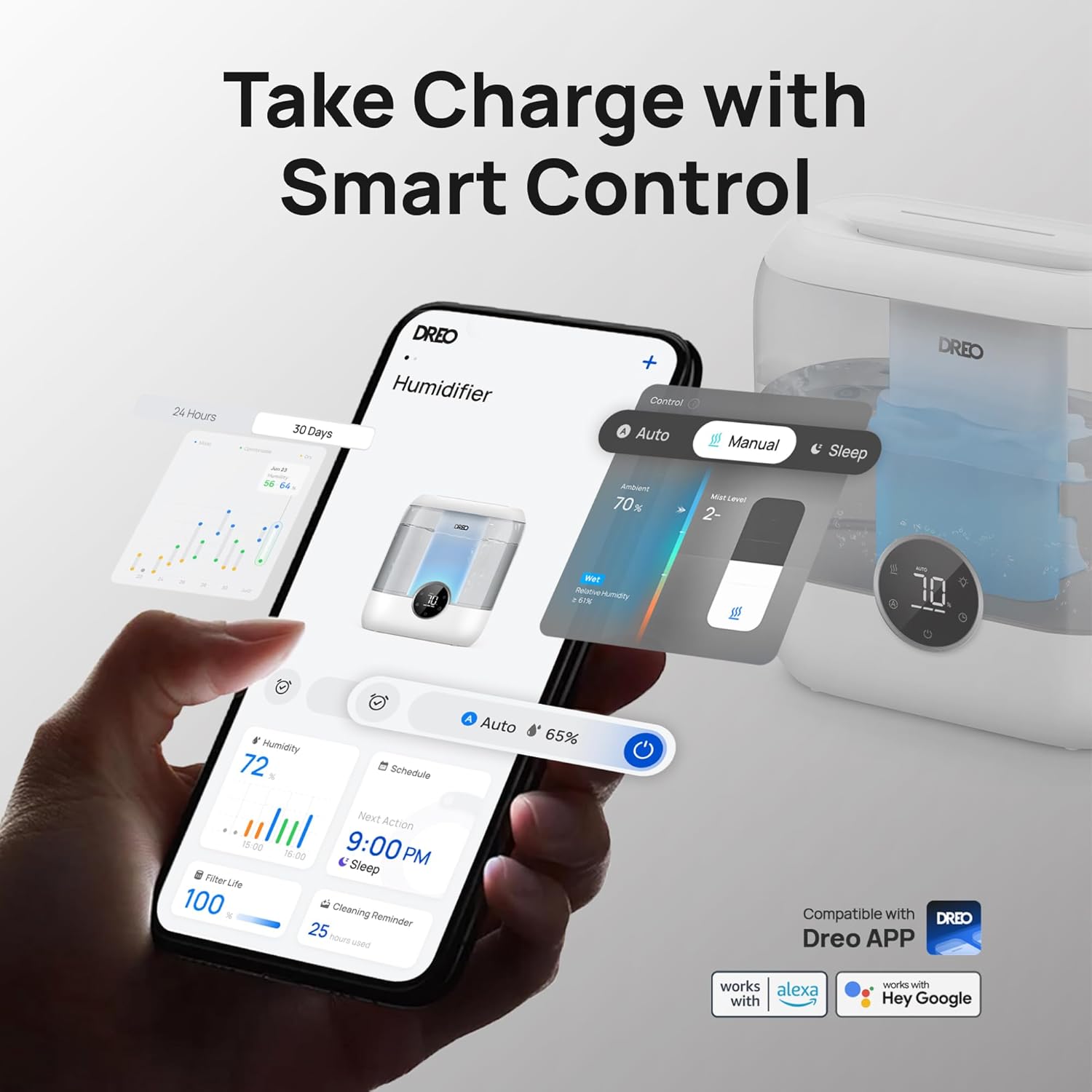 - 𝙃𝙪𝙢𝙞𝙙𝙞𝙛𝙮 𝘾𝙤𝙣𝙩𝙧𝙤𝙡, 𝙒𝙝𝙚𝙧𝙚𝙫𝙚𝙧 𝙔𝙤𝙪 𝘼𝙧𝙚: Use the DREO app, voice commands, or Alexa to remotely manage your plant humidifier, Easily monitor indoor humidity and adjust settings to ensure a healthy environment for your family, especially suited for babies, plants, and pets.