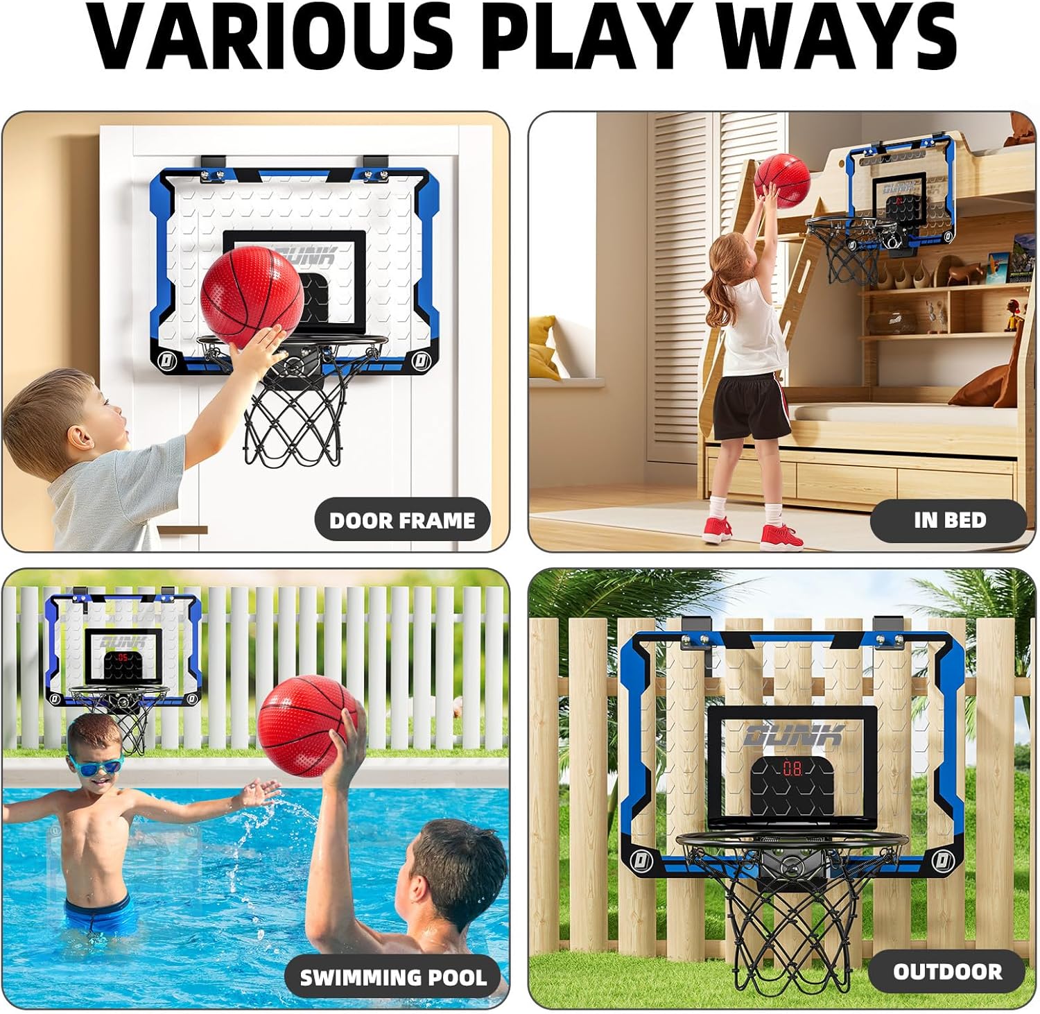 - Electronic Scoring Basketball Board - Our indoor basketball hoop comes with automatic scoring function and cheers sound, it will cheer and count points for your kids with every goal scored. With 4 rubber basketballs included, Kids can have a mini basketball game with friends or family, develop kid's interested in basketball. Perfect for indoor or outdoor play.