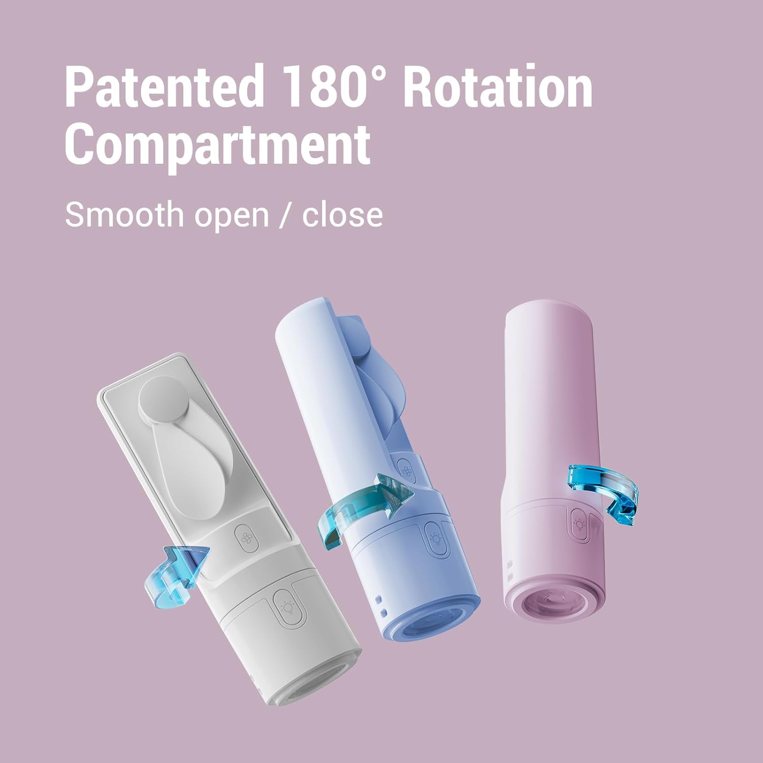 - Innovative 180-Degree Rotating Cover Design: Airluxe mini patented design, allowing it to open smoothly in either a clockwise or anti-clockwise direction. This design removes the need to pry or struggle to open, prevents the fan blades from getting pinched, and keeps the power button protected.