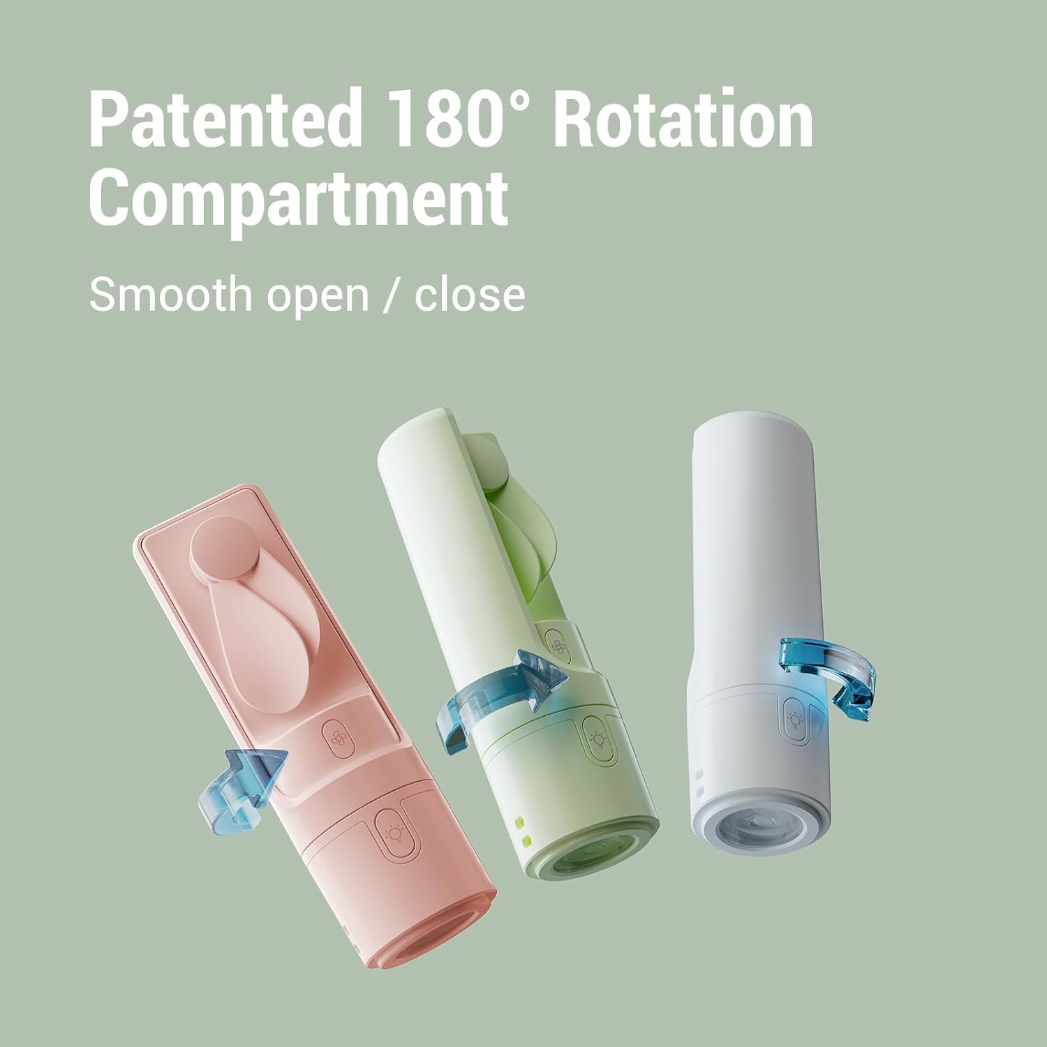 - Innovative 180-Degree Rotating Cover Design: Airluxe mini patented design, allowing it to open smoothly in either a clockwise or anti-clockwise direction. This design removes the need to pry or struggle to open, prevents the fan blades from getting pinched, and keeps the power button protected.