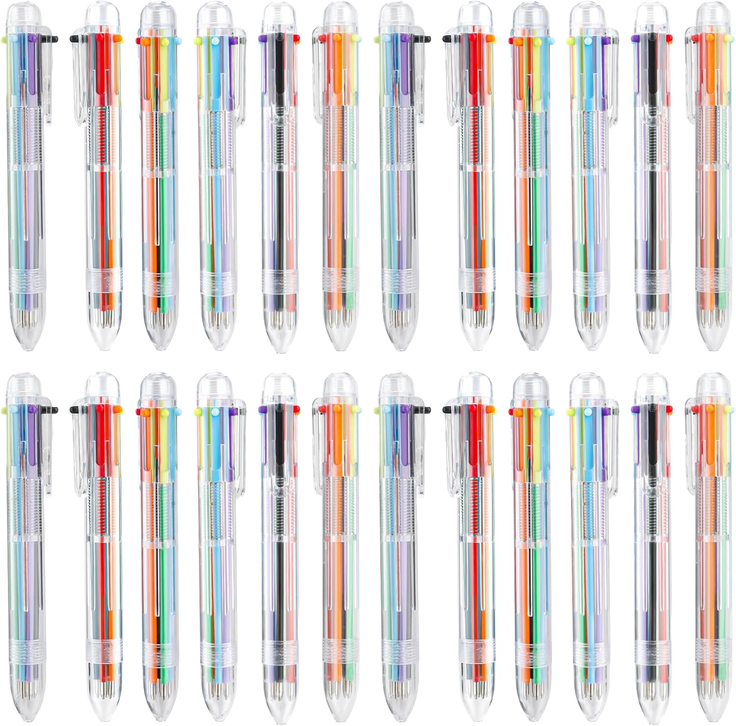 - PACKAGE CONTAINS: You will receive 24pcs ballpoint pens with transparent color shells to see the inner structure clearly. The 0.5 mm refill has a spring-loaded retractable design that allows you to quickly switch colors with just one click. The fade-resistant ink can be firmly written on sketchbooks, drawing books, notebooks, manuals, sticky notes, drawings and more. You can write and express yourself freely