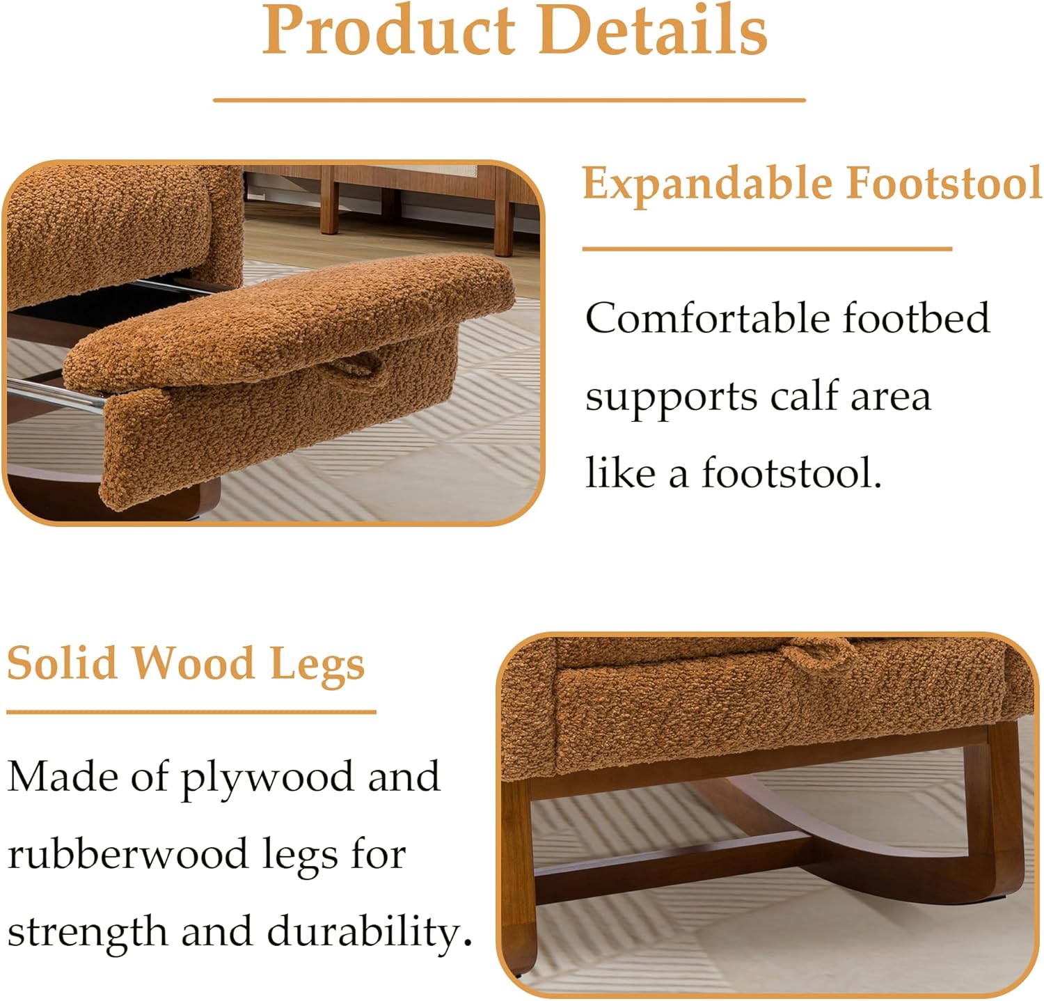 Nursery Rocking Chair with Foot Rest, Upholstered Glider Chair with Two Side Pockets, High Back Nursing Chair, Rocker Accent Armchair for Bedroom Living Room (Caramel)