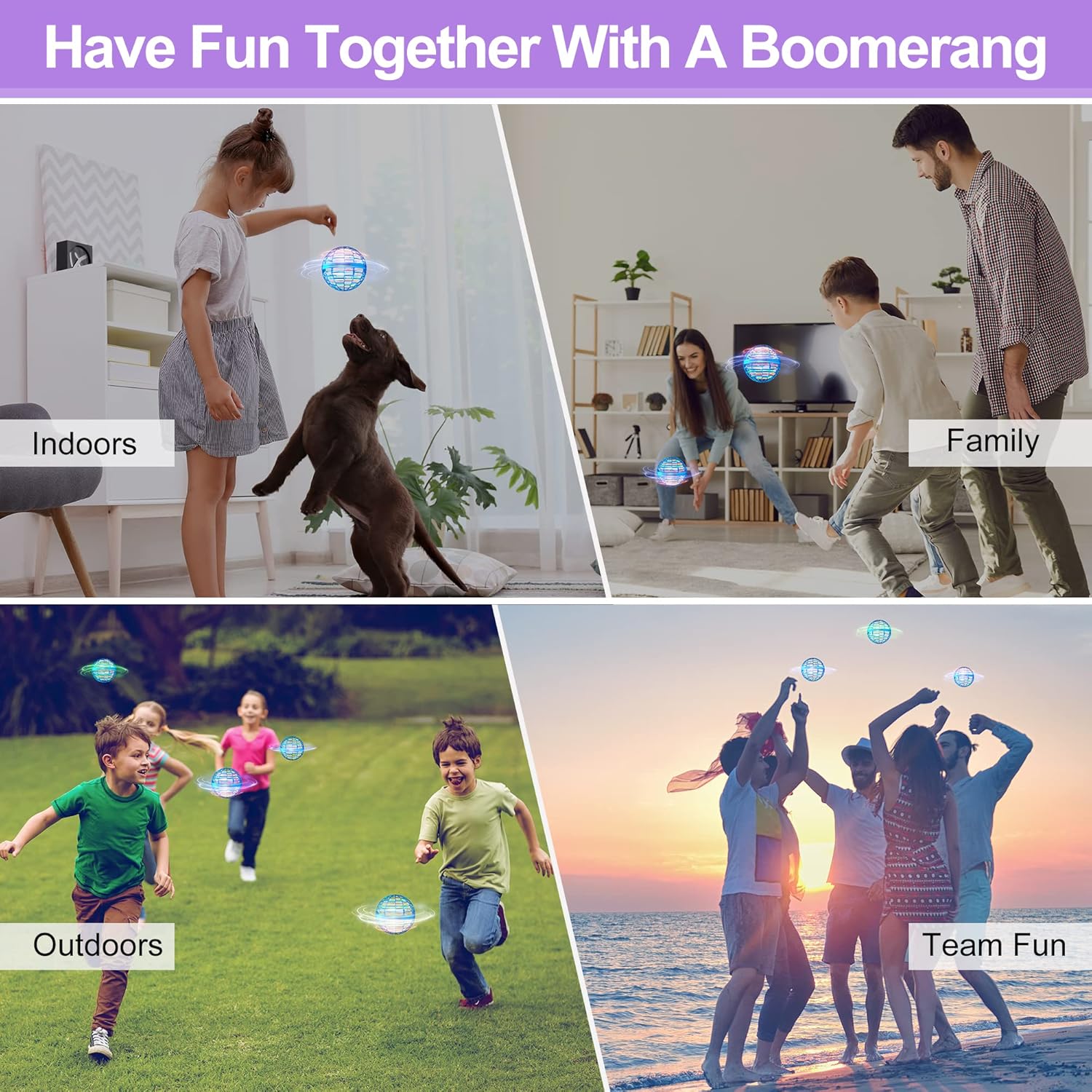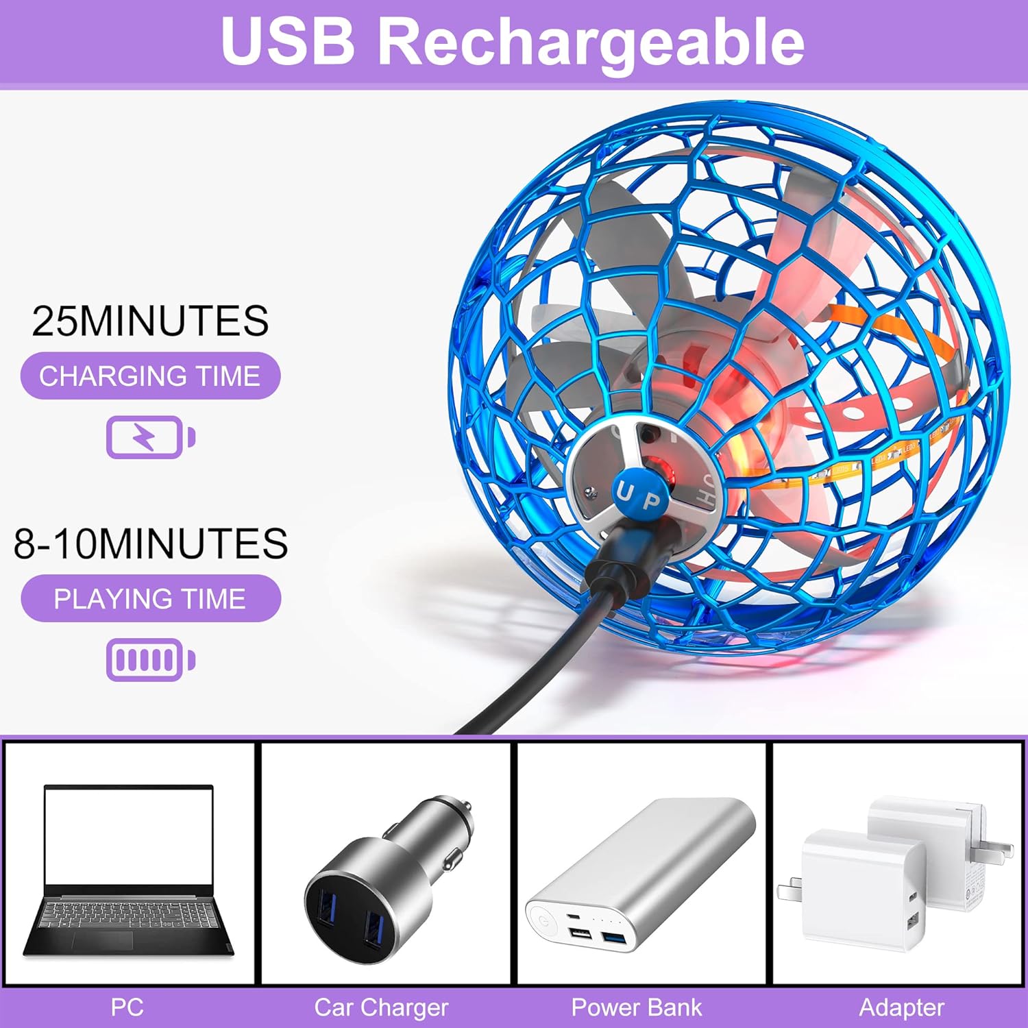 - 【USB Rechargeable & Portable】 25 minutes to fully charge, make your boomerang ball fly for full 10 minutes of pure flight time. Red light will light up when charging, complete will go out. The included USB charging cable be used with computer/ car charger/ power banks/ phone adapter, etc.