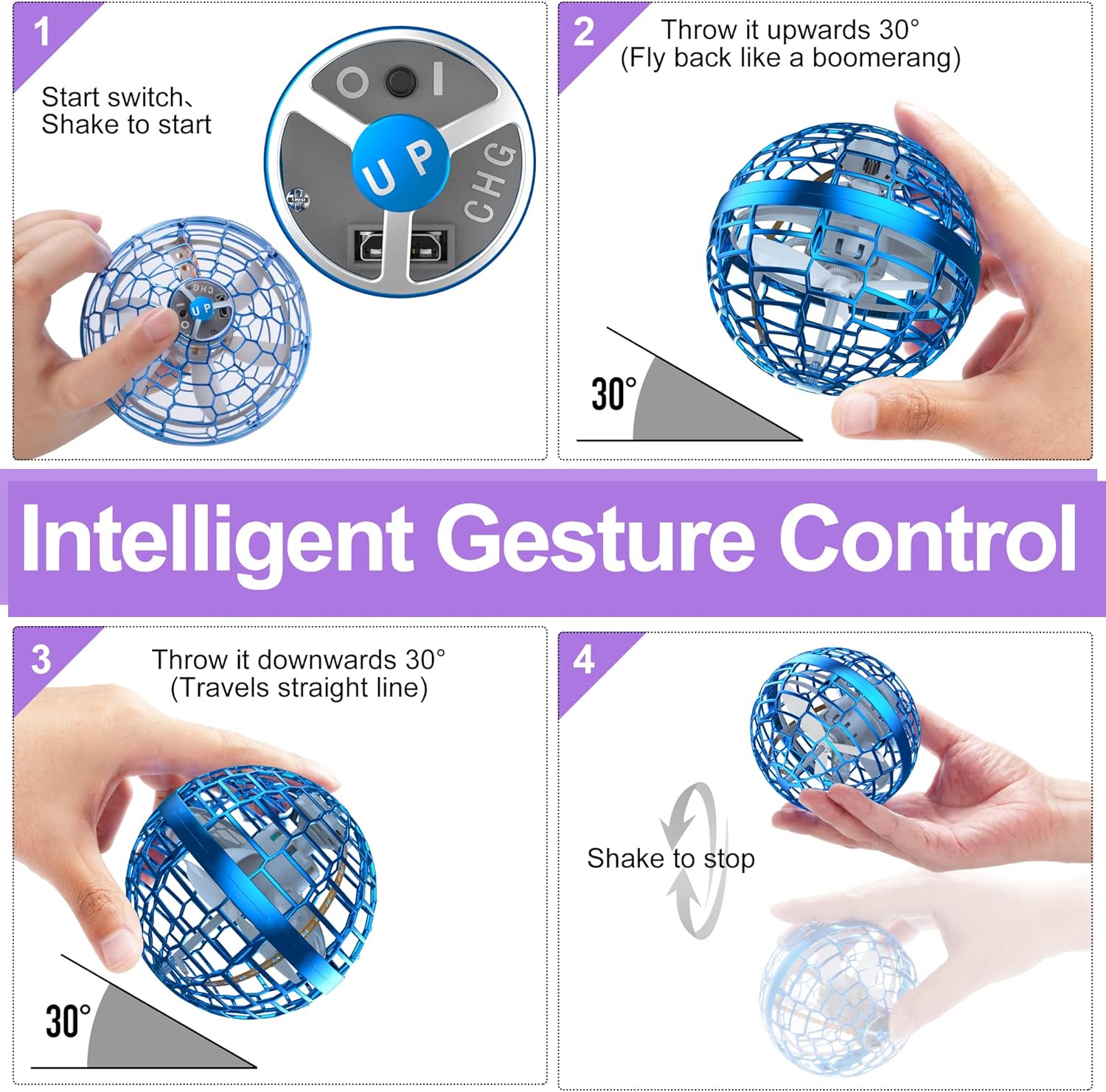 - 【Simple and Easy to Play】 Turn on the switch at first, the "UP" sign is up, then shake the flying ball to make it spin. If you throw it up 30° to fly, it will turn around like a boomerang and return to you. Fly in a steady straight line when flying down 30°. Just shake it to stop flying.