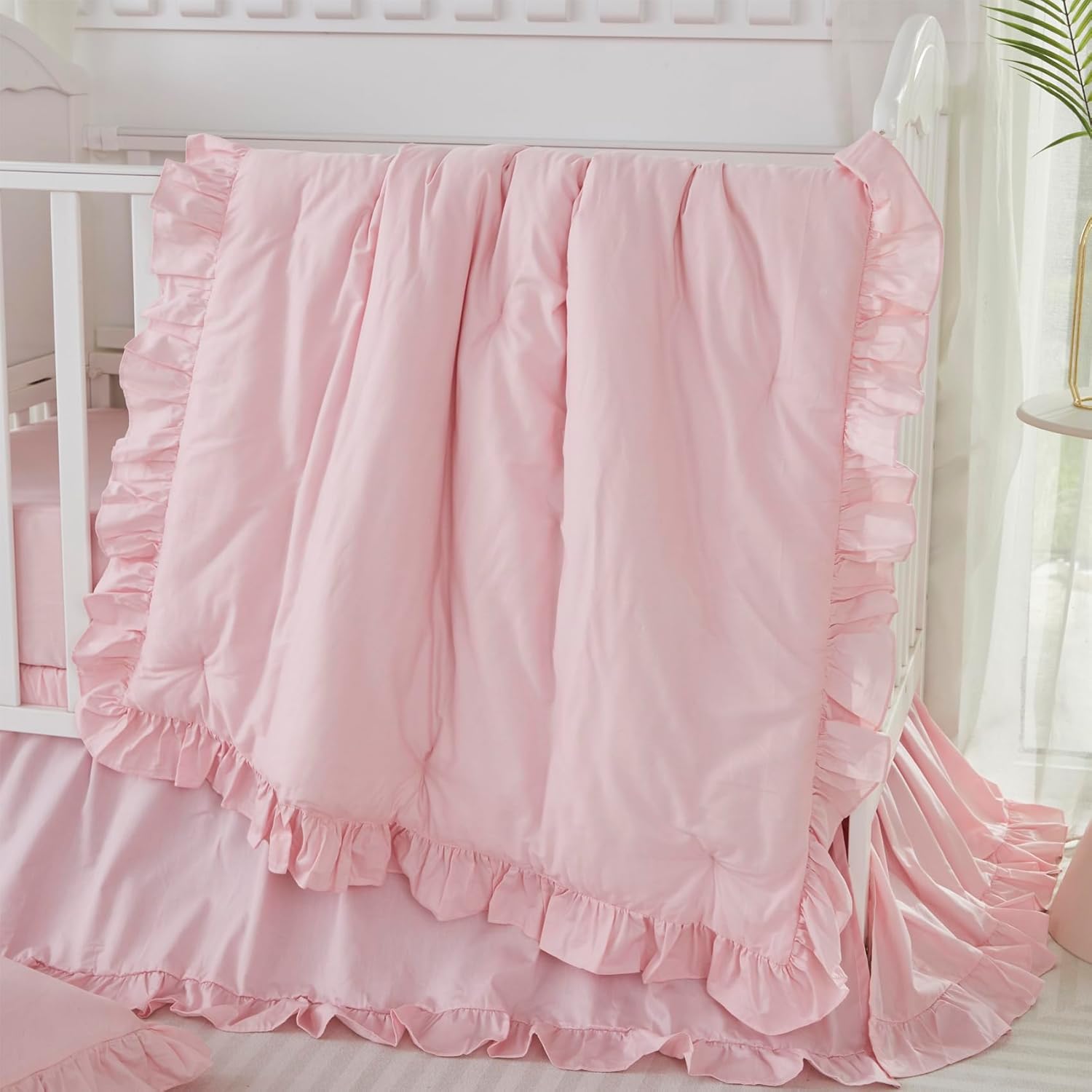 - 3-piece pink ruffles Crib Bedding Set for Girls or Boys Includes: Crib Comforter, Fitted Crib Sheet, Crib Bed Skirt