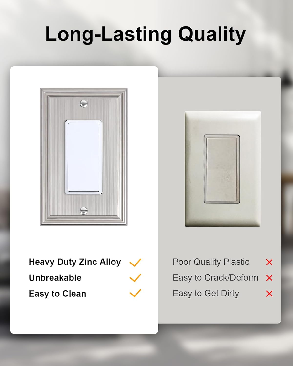 - Durable Solid Zinc Alloy - Constructed from thick and sturdy zinc alloy, the wall outlet cover offers exceptional durability and sturdiness, easier to clean and maintain. It is resistant to high impact, tarnishing, and corrosion, unbreakable. Ensuring it remains its stunning appearance for years to come.
