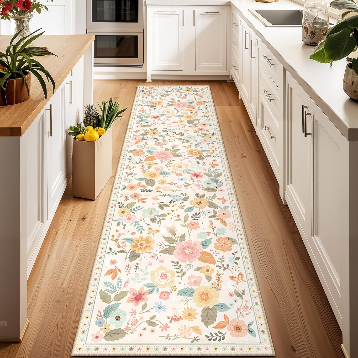 - Machine Washable:The runner rugs are machine washable,allowing for both machine wash and hand wash options.It is recommended to wash them in cold water.This floral rug is crafted with a low pile that won’t block opening and closing doors, make machine wash possible. Small stains can be blotted with a rag,soft-bristled brush,vacuum,or robotic vacuum cleaner.Avoid using bleach and high-temperature ironing
