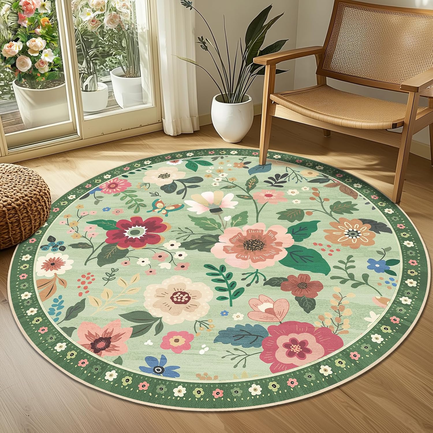 - Machine Washable:The round rug are machine washable,allowing for both machine wash and hand wash options.It is recommended to wash them in cold water.This floral rug is crafted with a low pile that won’t block opening and closing doors, make machine wash possible.Small stains can be blotted with a rag,soft-bristled brush,vacuum,or robotic vacuum cleaner.Avoid using bleach and high-temperature ironing