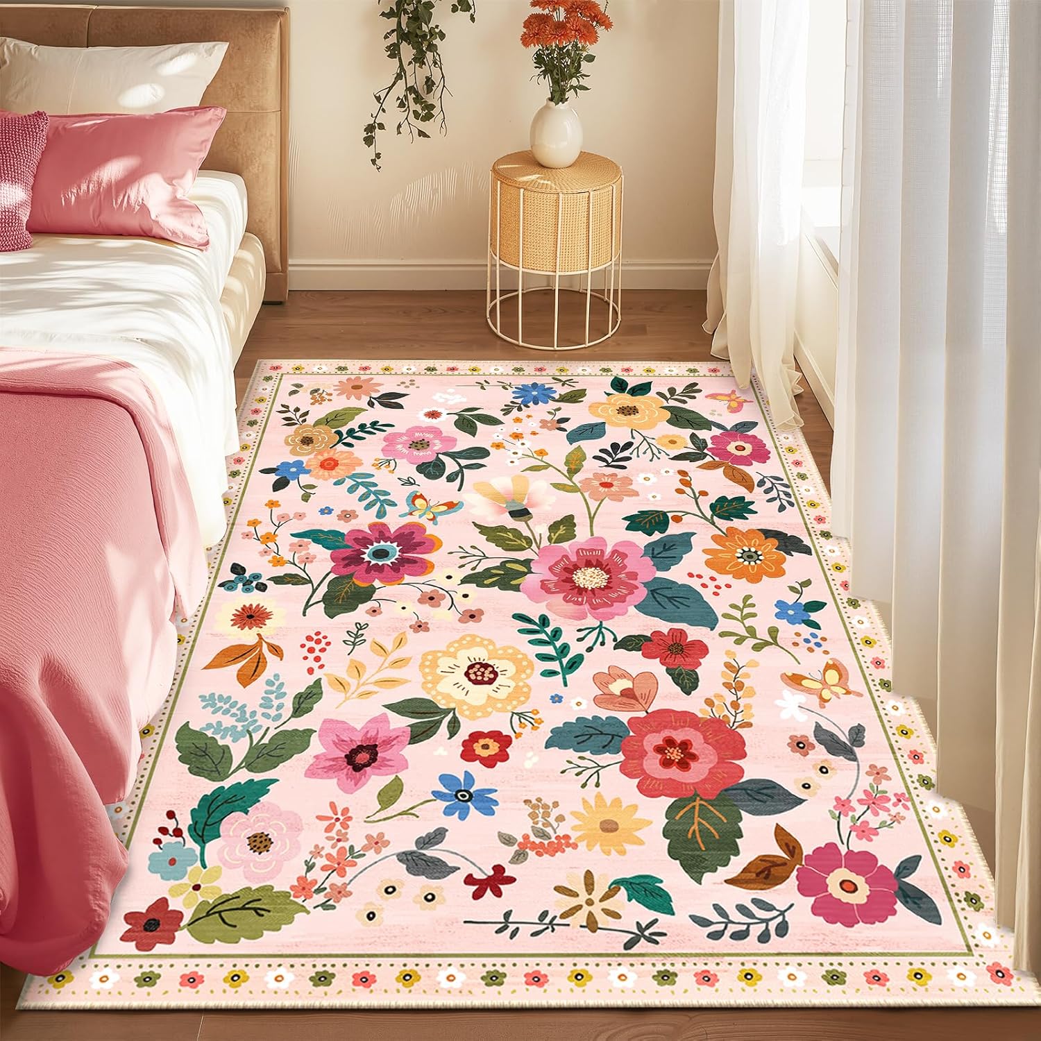 Floral 4x6 Area Rug Machine Washable Soft Print Boho Carpet Non Slip Doormat Low Pile Flower Area Rugs for Living Room Bedroom Nursery Kitchen Dining Room Indoor-Pink