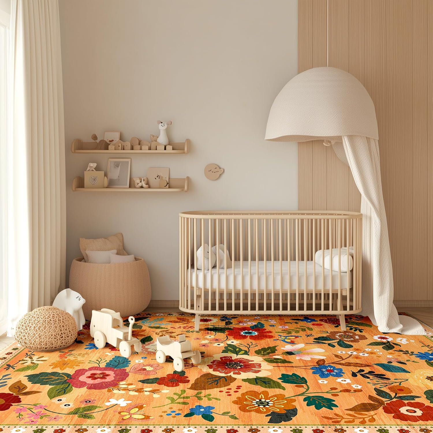 Floral 9x12 Area Rug Machine Washable Soft Print Boho Carpet Non Slip Doormat Low Pile Flower Area Rugs for Living Room Bedroom Nursery Kitchen Dining Room Indoor-Yellow/Orange
