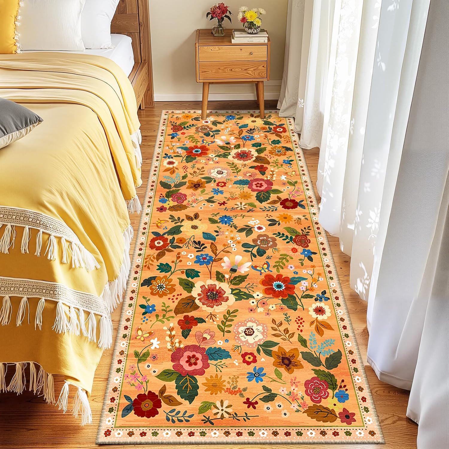 Floral 2x8 Area Rug Machine Washable Soft Print Boho Carpet Non Slip Doormat Low Pile Flower Area Rugs for Living Room Bedroom Nursery Kitchen Dining Room Indoor-Yellow/Orange