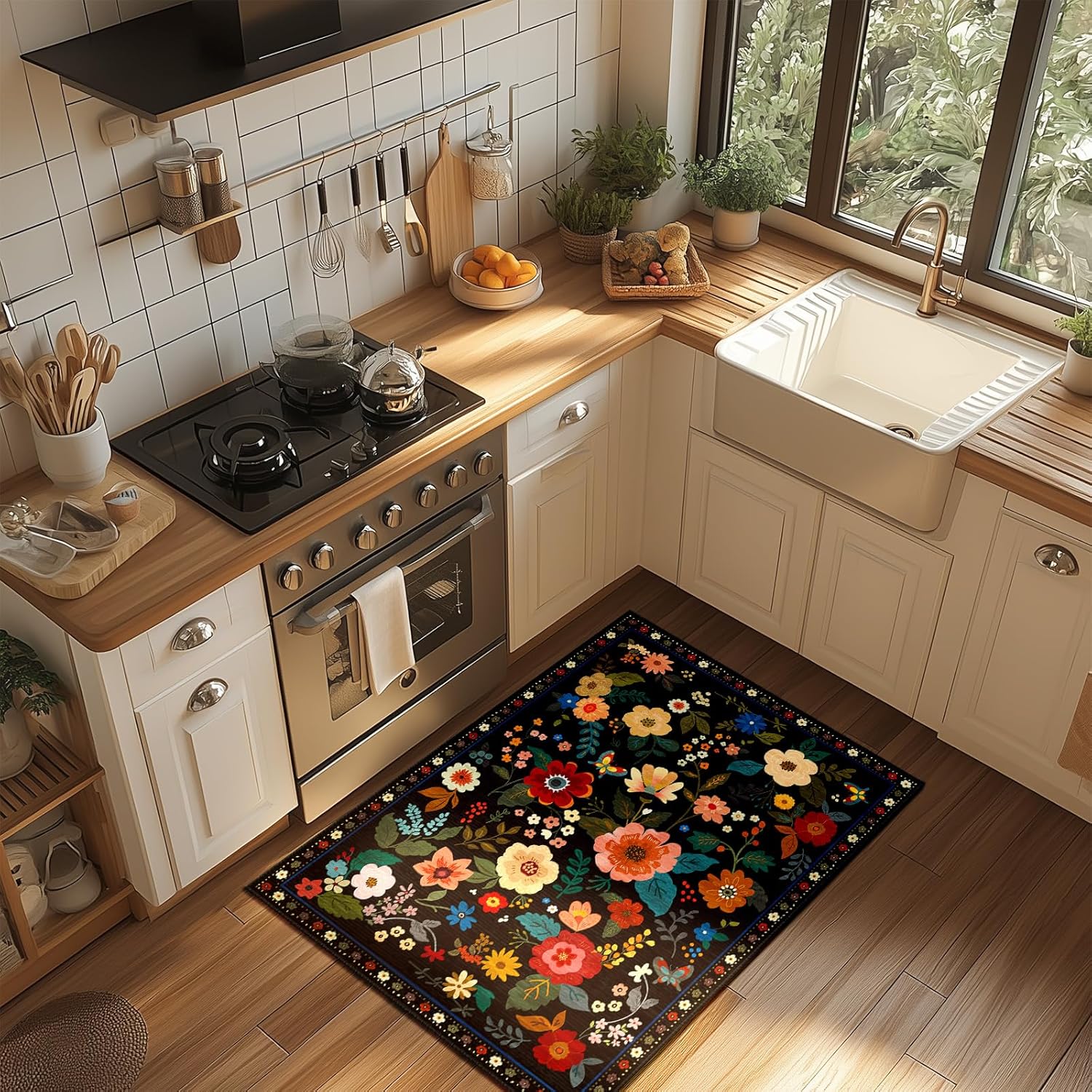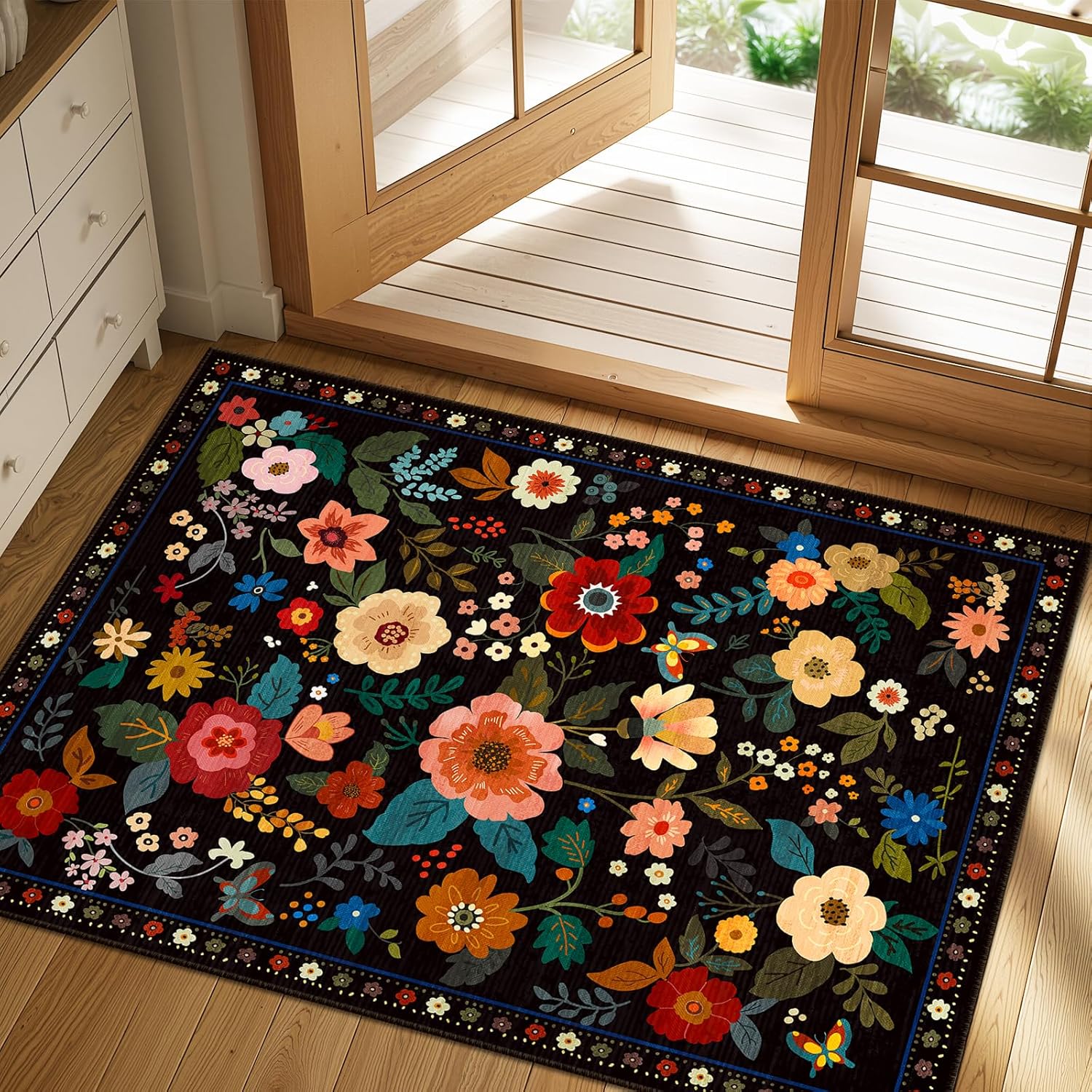 Floral 2x3 Area Rug Machine Washable Soft Print Boho Carpet Non Slip Doormat Low Pile Flower Area Rugs for Living Room Bedroom Nursery Kitchen Dining Room Indoor-Black