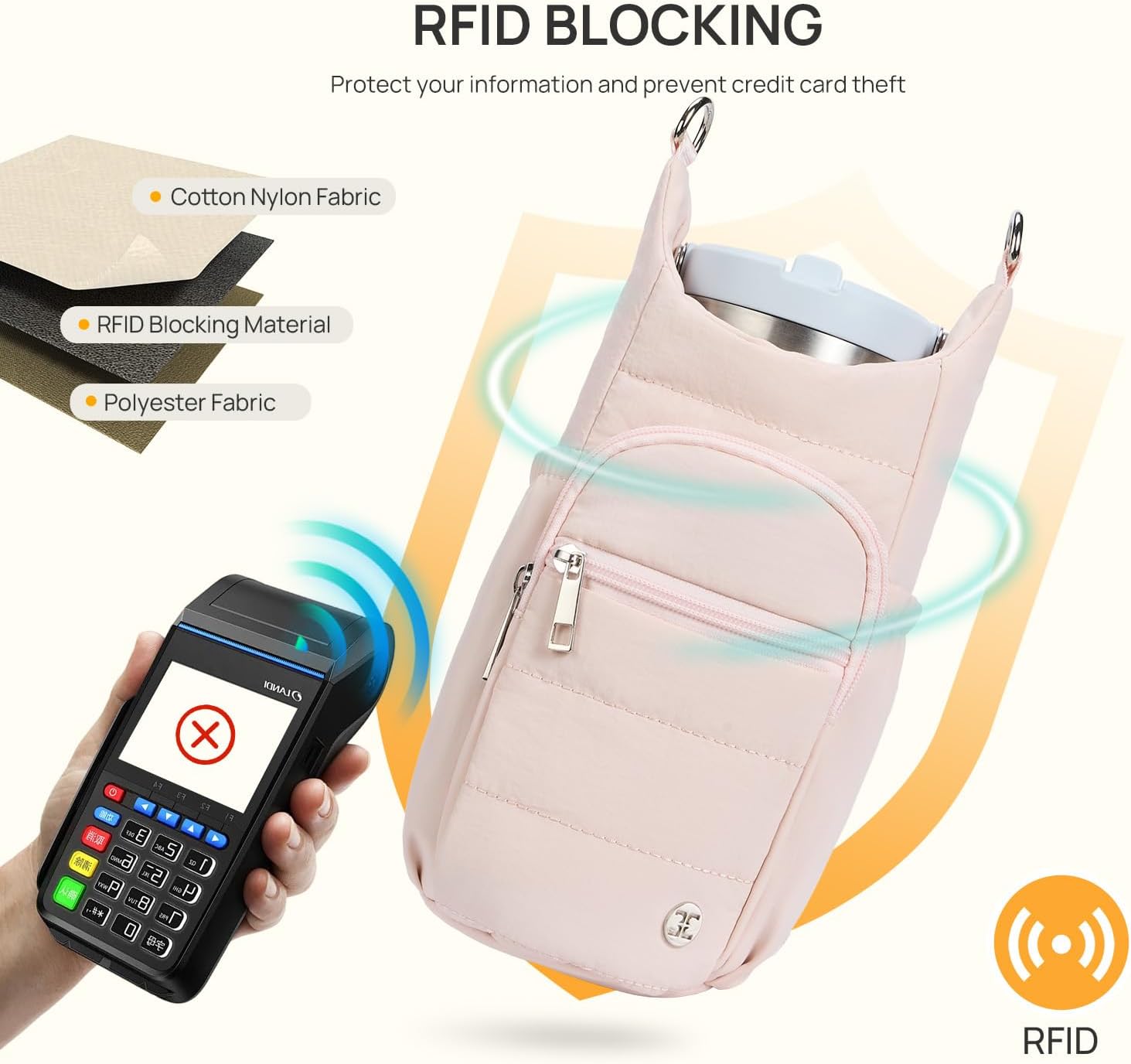 - Multiple Pockets: Water bottle carrier bag come with phone pocket for cellphone under 6.7". Front zipper pocket and inner card slots can place small items like your cards or change. Two side pocket can be used to store items you need to grab quickly, such as headphones. The bag also comes with a lanyard for hanging keys and more
