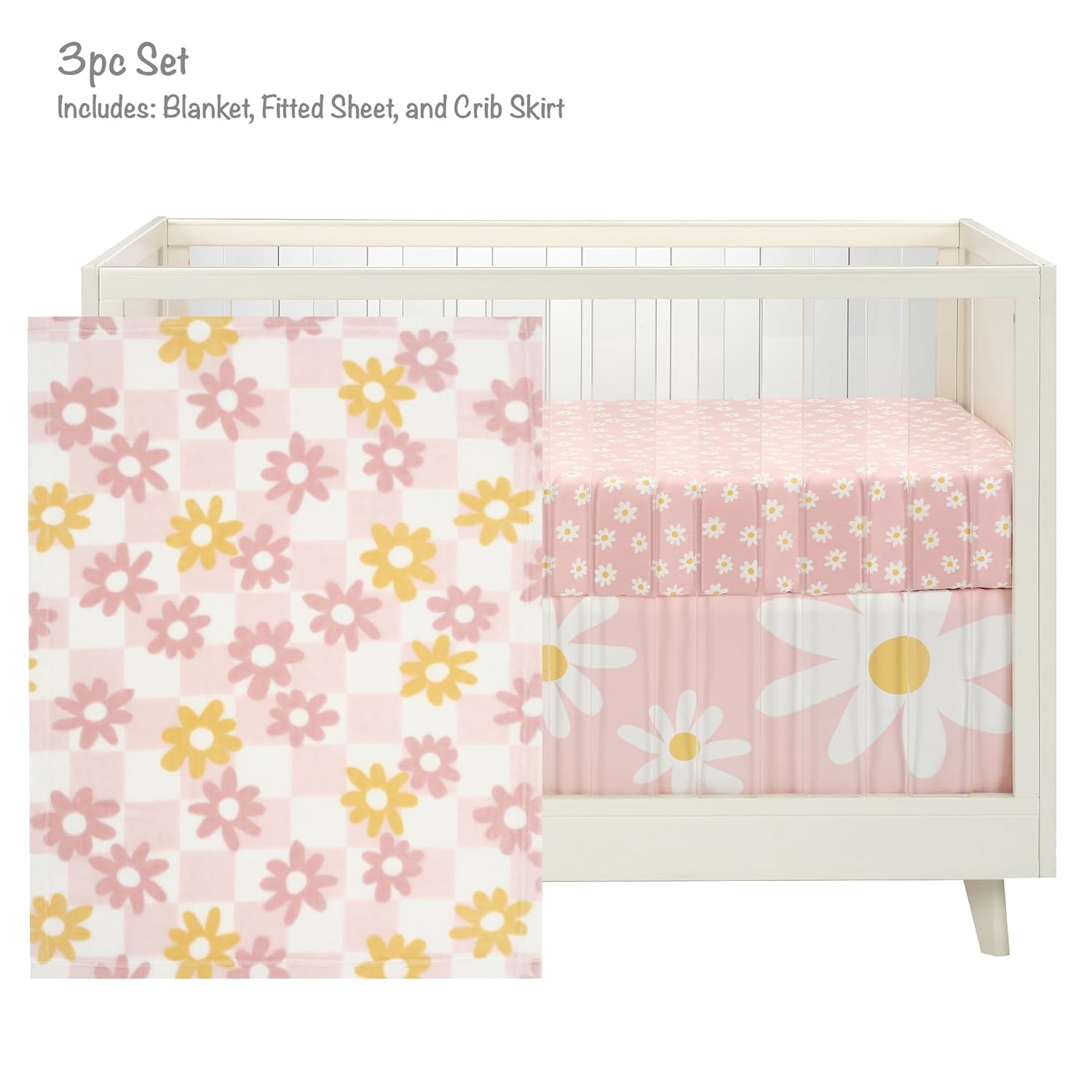 - Crib skirt is petal pink with various size white daisies