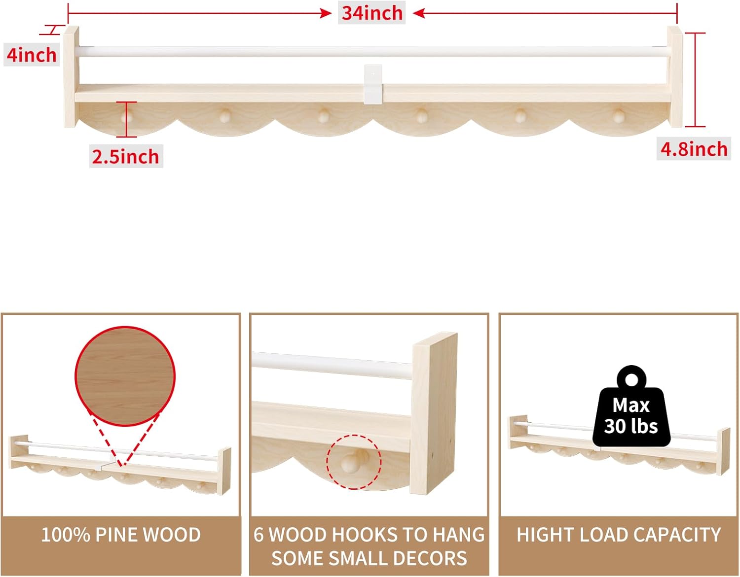 - 【STURDY AND DURABLE】:The wall shelf made of high quality pine wood. Our shelf combines the functionality of a coat rack and a floating shelf. Does not only be used it to hold a whole row of books,pictures, and stuffed animals , would be great also to hold backpacks, towels, keys, scarves or hats too. It is attractive and very functional.